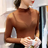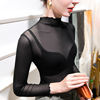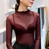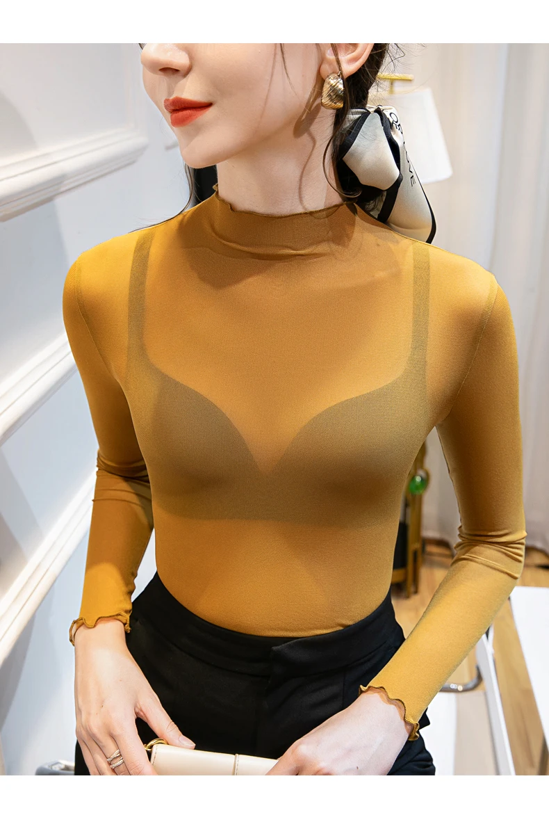 40-85 كجم الفتيات انظر من خلال شبكة النسيج تي شيرت المحملات الإناث كامل كم Ruched و نصف الياقة المدورة التي شيرت قمم المرأة الربيع الخريف