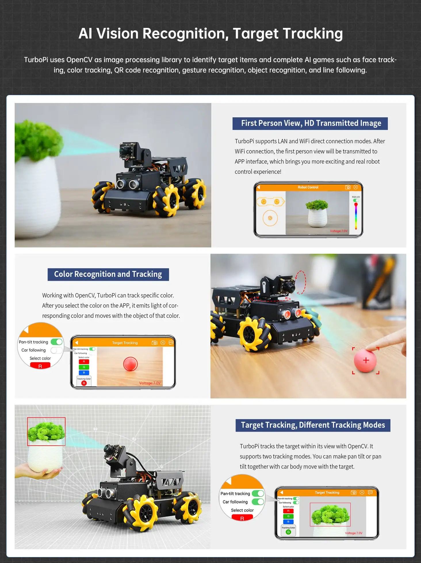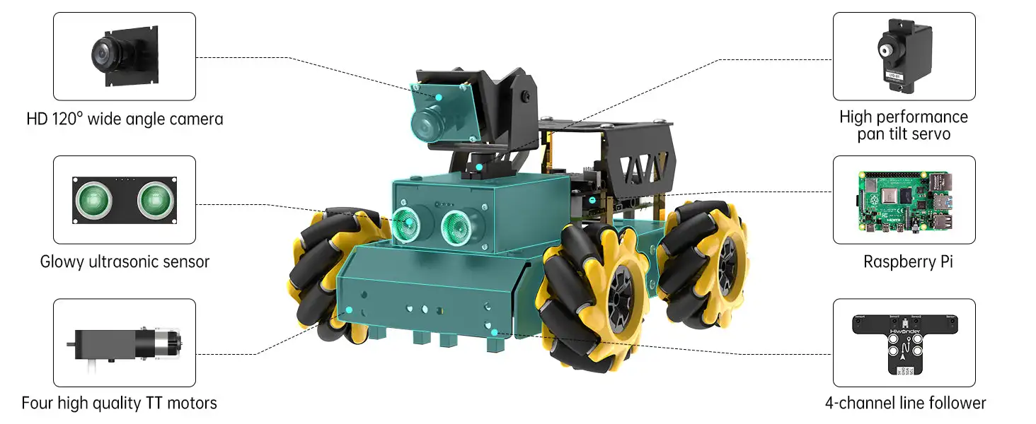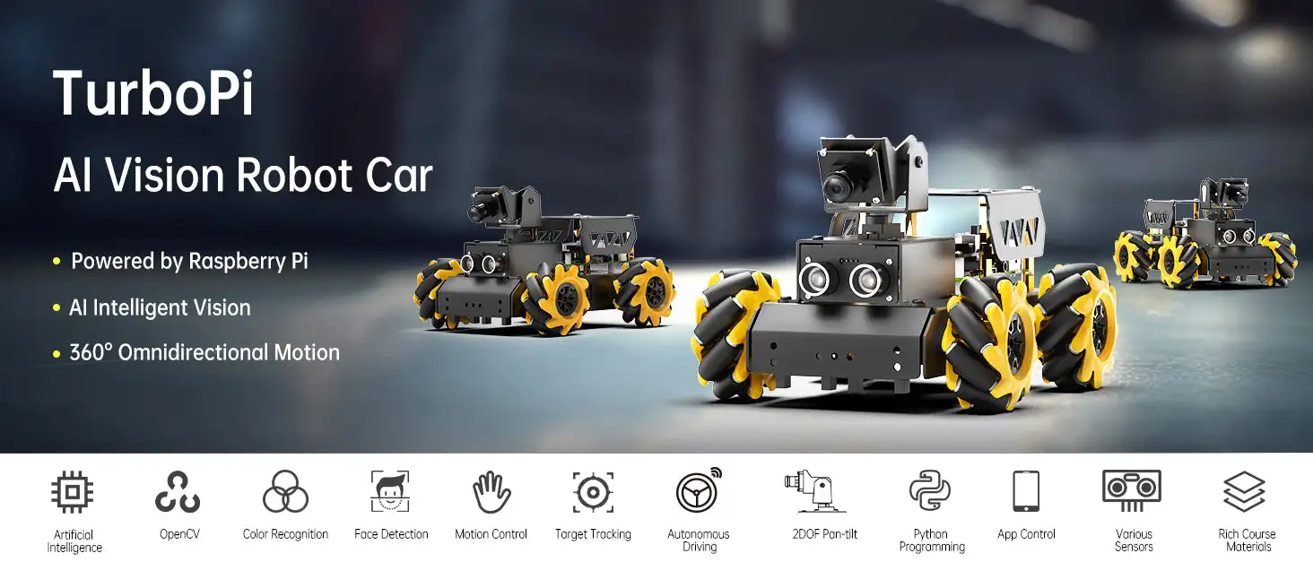 TurboPi is a smart vision robot car powered by Raspberry Pi. It is built on a Mecanum-wheel chassis, adopts high-performance pan-tilt servos, HD camera and 4-ch line follower, and can be programmed in Python. With its impressive capabilities, TurboPi unlocks diverse AI applications.