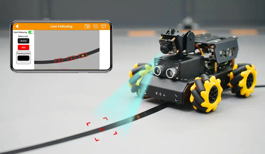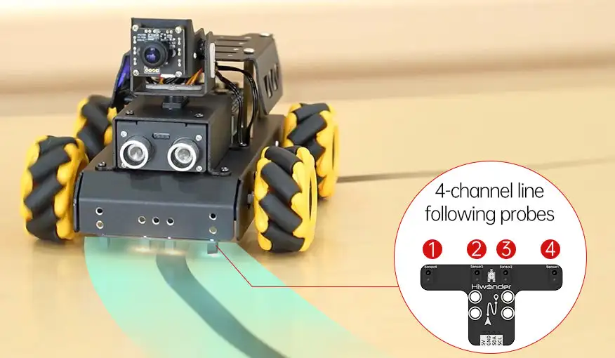 TurboPi uses 4 infrared probes on 4-channel line follower to detect and follow line.
