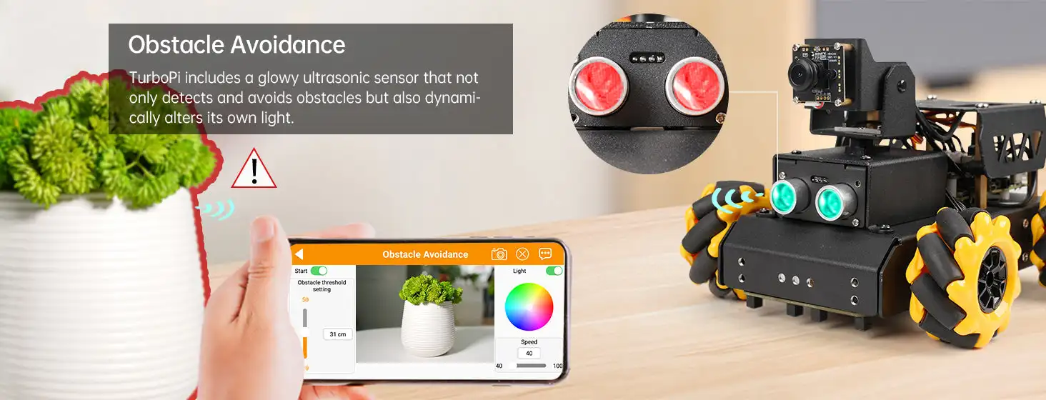 Equipped with RGB glowy ultrasonic sensor whose light can be adjusted, TurboPi is able to avoid obstacle smartly. In