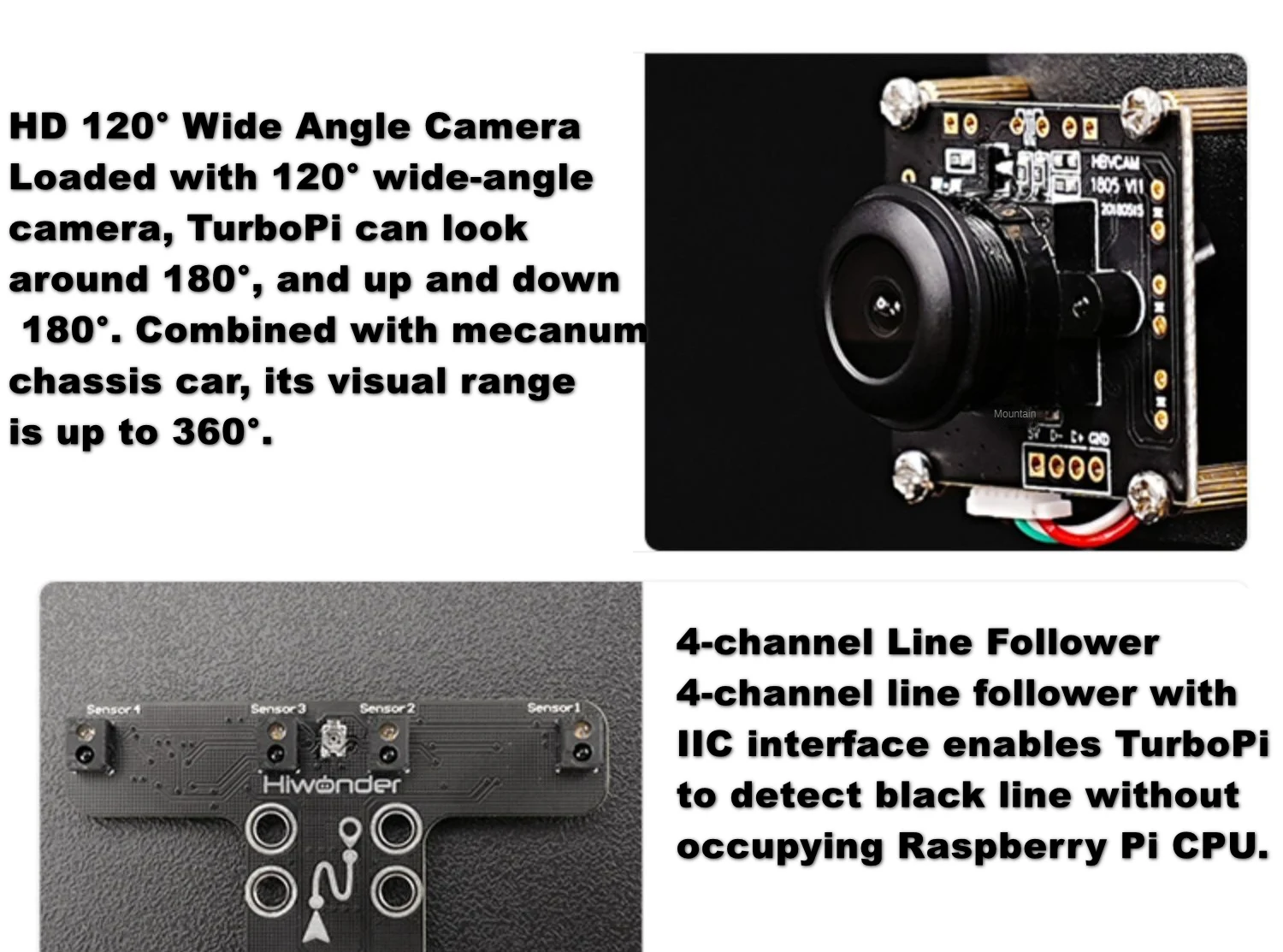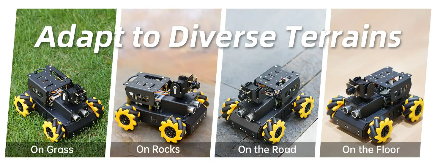 With 4 omnidirectional mecanum wheels, TurboPi can move 360°. Different movement modes (move forward, horizontally, diagonally and rotate ) and excellent perform-ance make it bold to challenge various complicated routes.