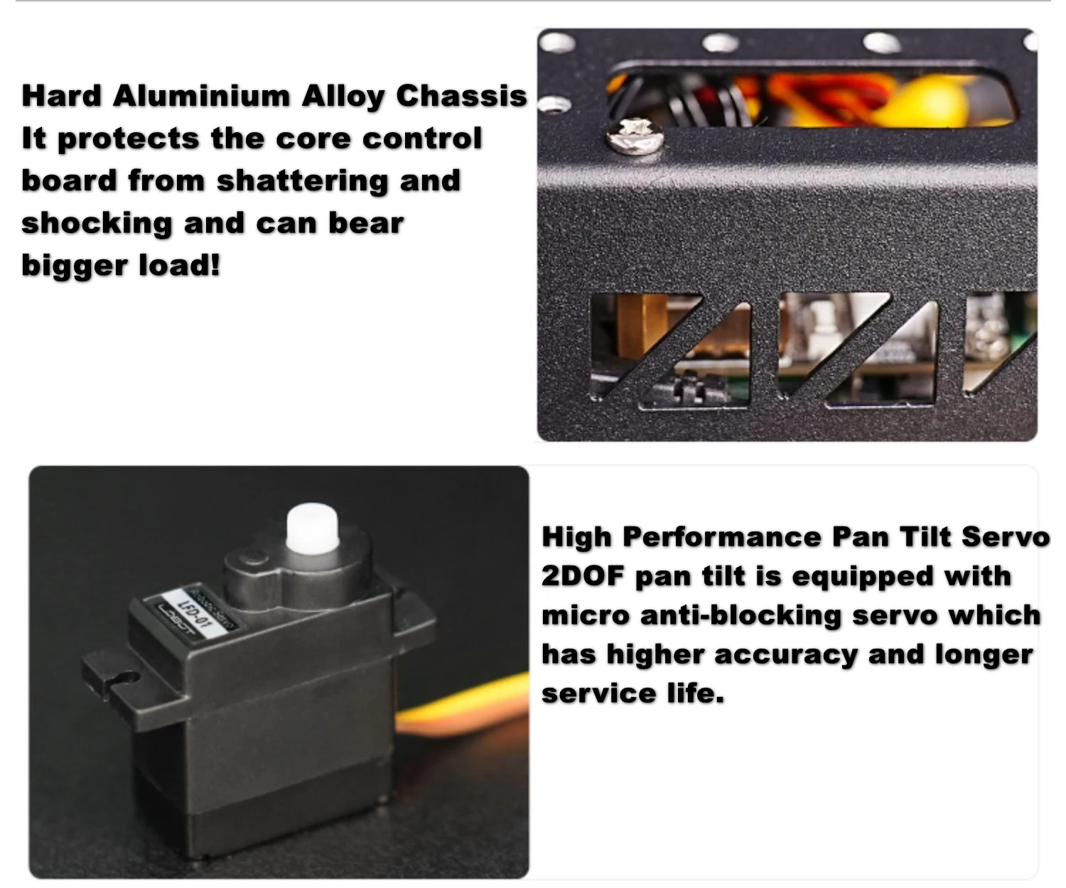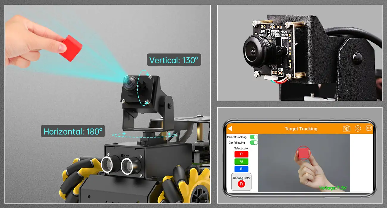 Equipped with two anti-blocking servos, pan-tilt can rotate 130°vertically and 180° horizontally, which contributes to 360° camera field of view.