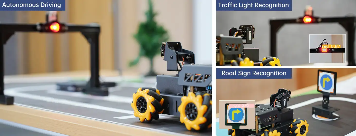 It combines 4-channel line follower and camera to achieve autonomous driving. Line follower is responsible for line following function, and camera is used to recognize traffic light and road signs.