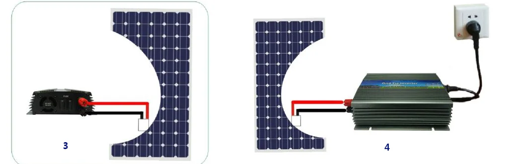 Connect the solar panels positive terminal to inverter’s positive terminal,and negative to negative.And you must screw up the nut to avoid the had contact.Show in 3