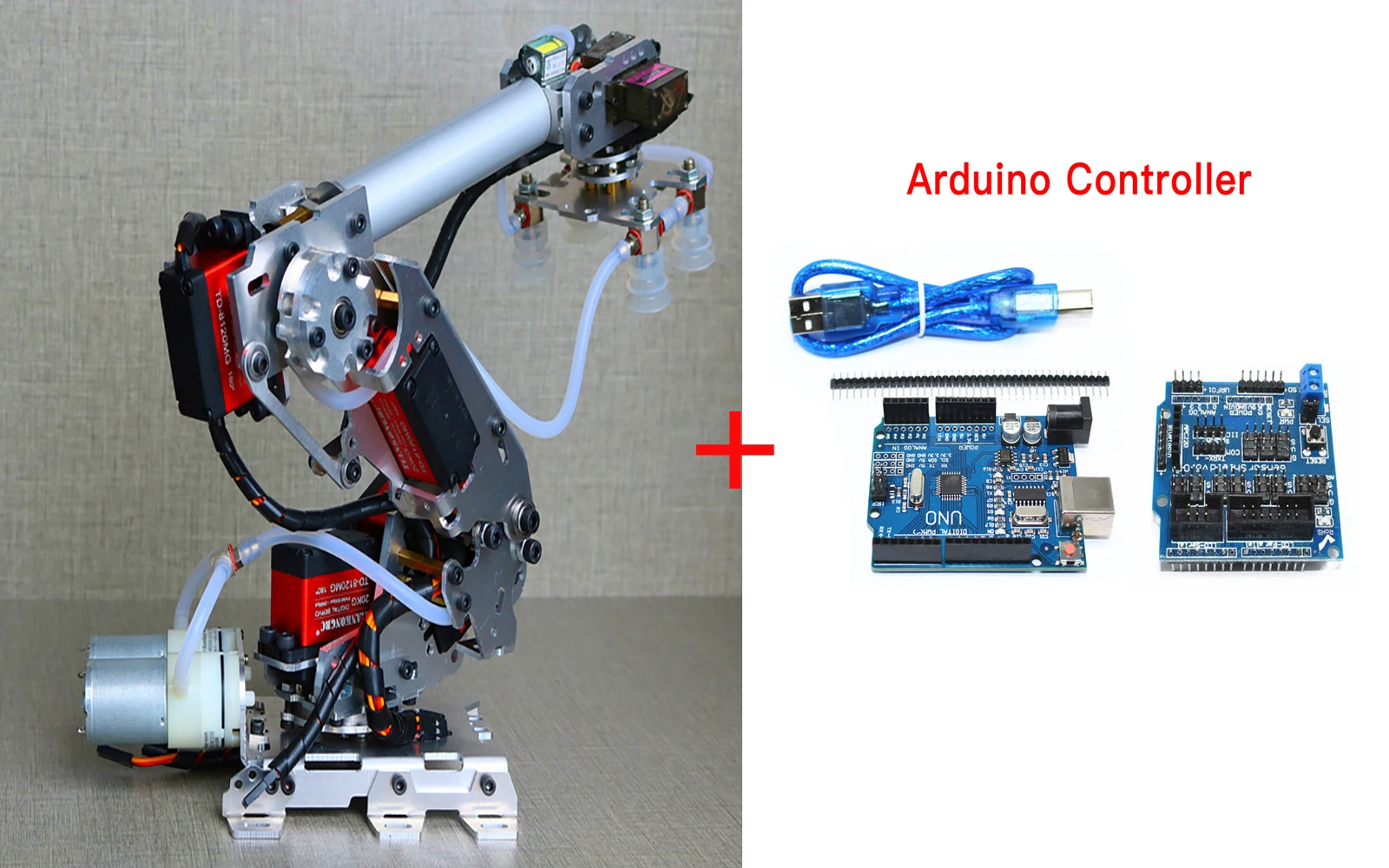 Arduino Full set = 1 set robot arm+ 1 set air pump(Free gift)+ 5pcs MG996 servos+ 2pcs MG90s servos+ 1pcs UNO R3 board for Arduino+ 1pcs servo driver board+ 1pcs USB cable