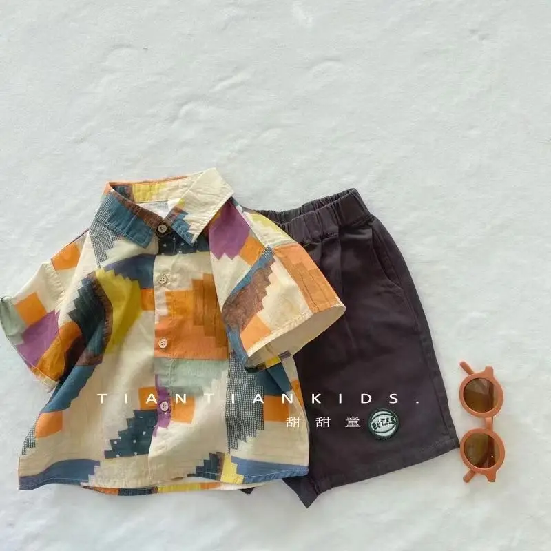 80-120 سنتيمتر طفل وتتسابق مجموعة طفل الفتيان الصيف 2023 جديد الكورية اللون شعرية الرضع قصيرة الأكمام قميص وسيم السراويل 2 قطعة مجموعة