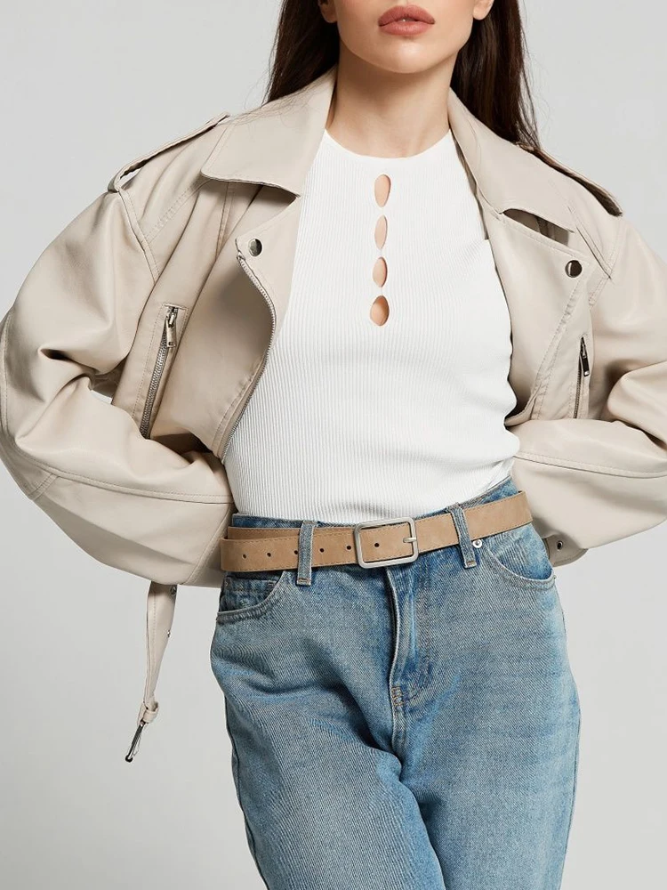 Ailegogo New Spring Autumn Women Loose Moto Biker Pu Faux Leather Jacket Streetwear Female Belt Zipper Coat Outwear
