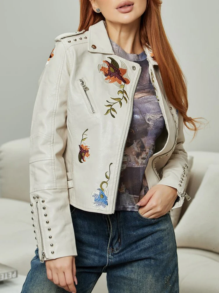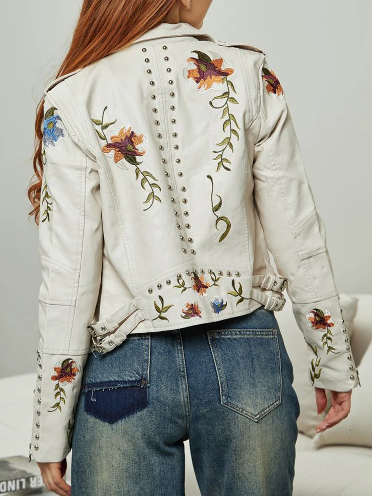 Ailegogo Spring Autumn Women Retro Floral Print Embroidery Pu Faux Leather Jacket Streetwear Female Zipper Rivet Coat Outwear