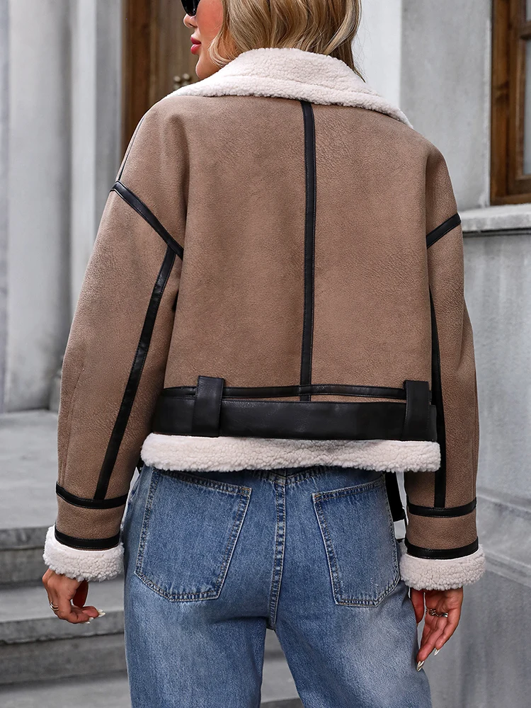 Ailegogo Streetwear Women Loose Thick Warm Faux Lamb Fur Coat Autumn Winter Female Retro Zipper Belt Jacket Outwear