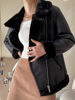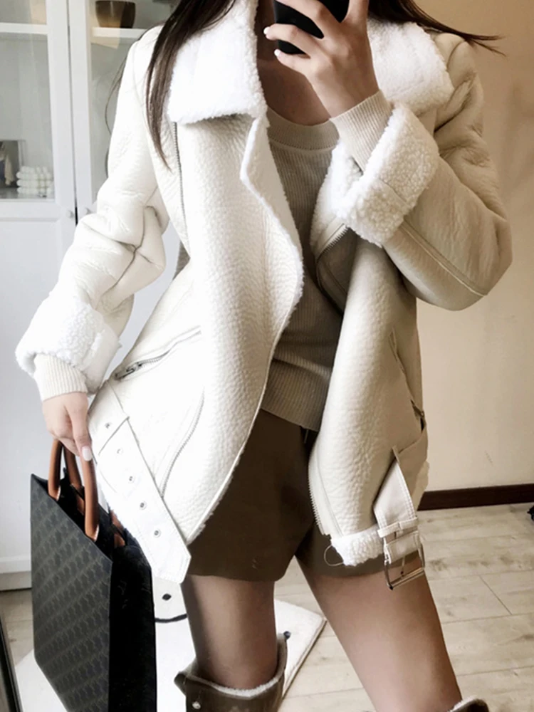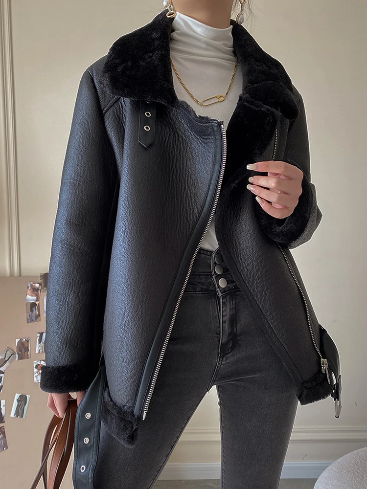 Ailegogo Streetwear Women Loose Thick Warm Faux Leather Fur Jacket with Belt Moto Biker Female Soft Sheepskin Coat Outwear