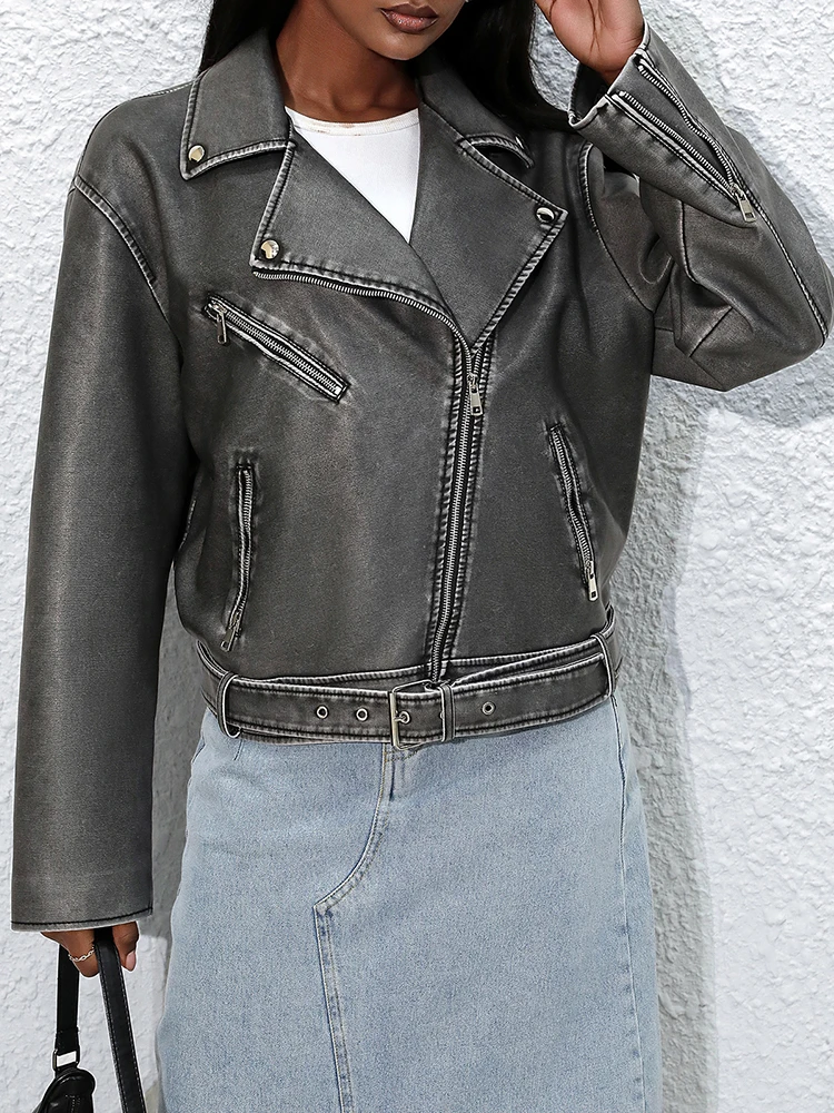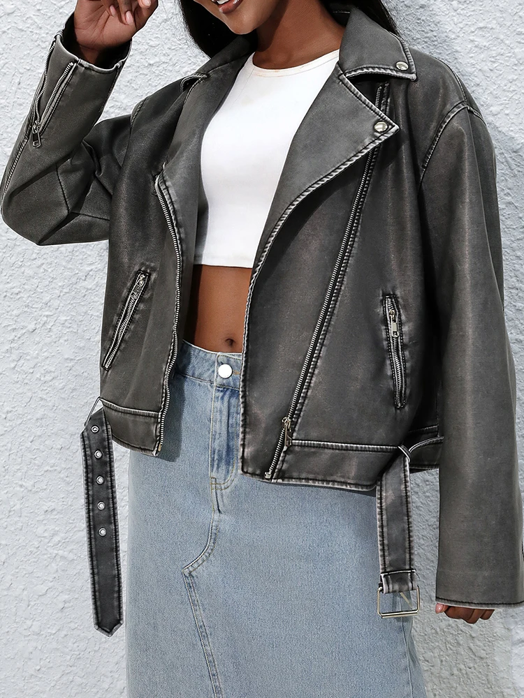 Ailegogo Streetwear Women Retro Loose Pu Faux Leather Jacket Spring Autumn Female Zipper Belt Coat Vintage Outwear