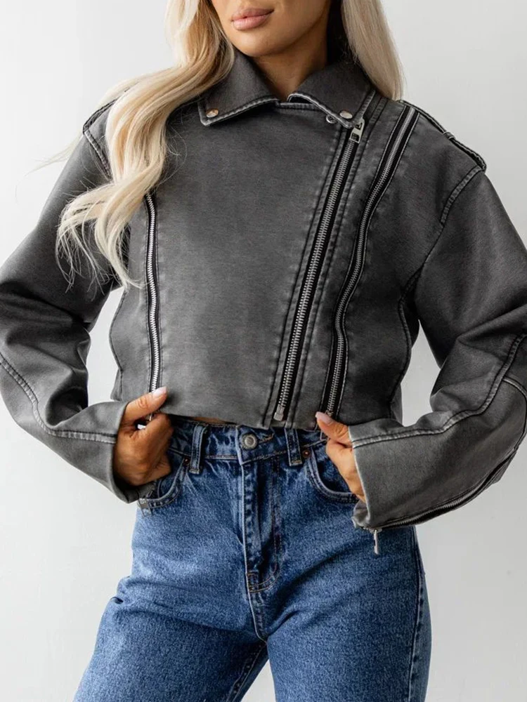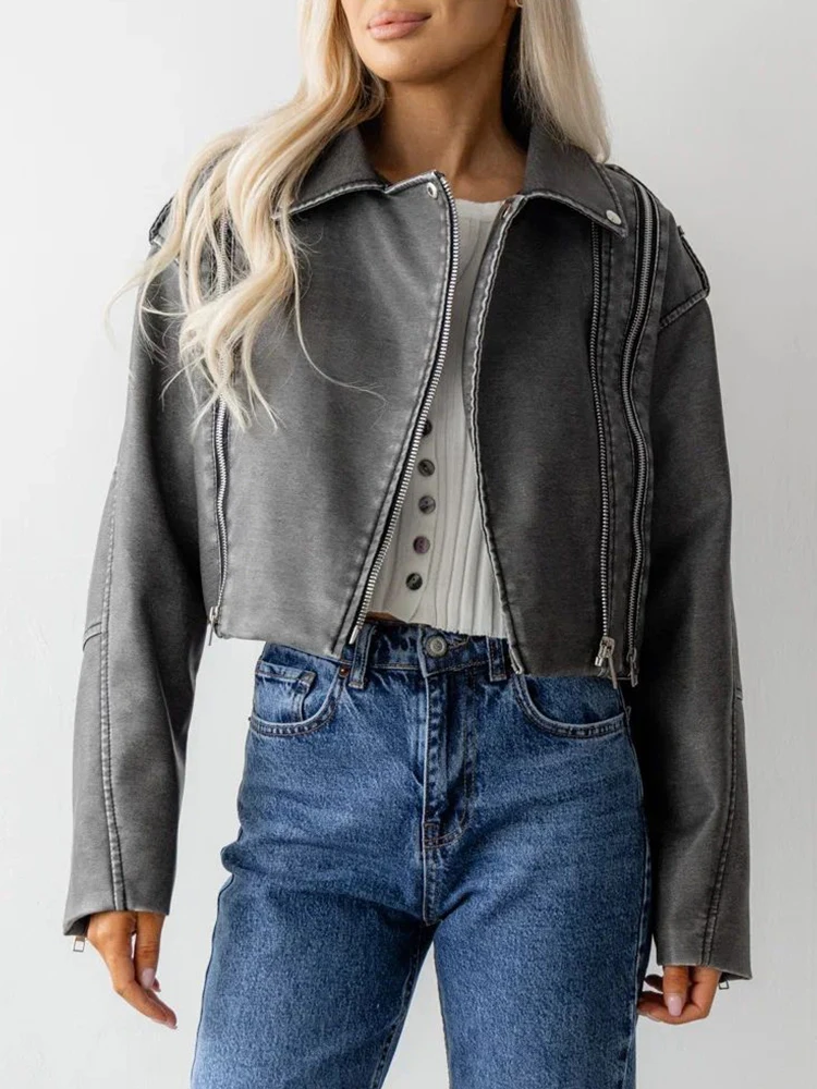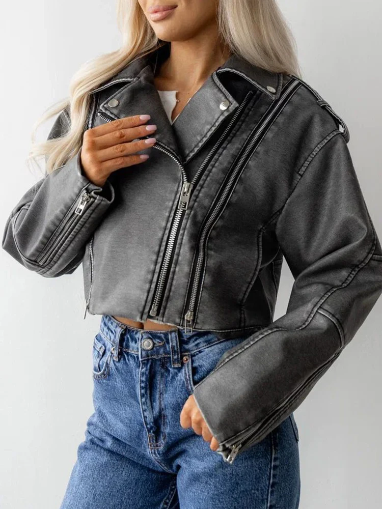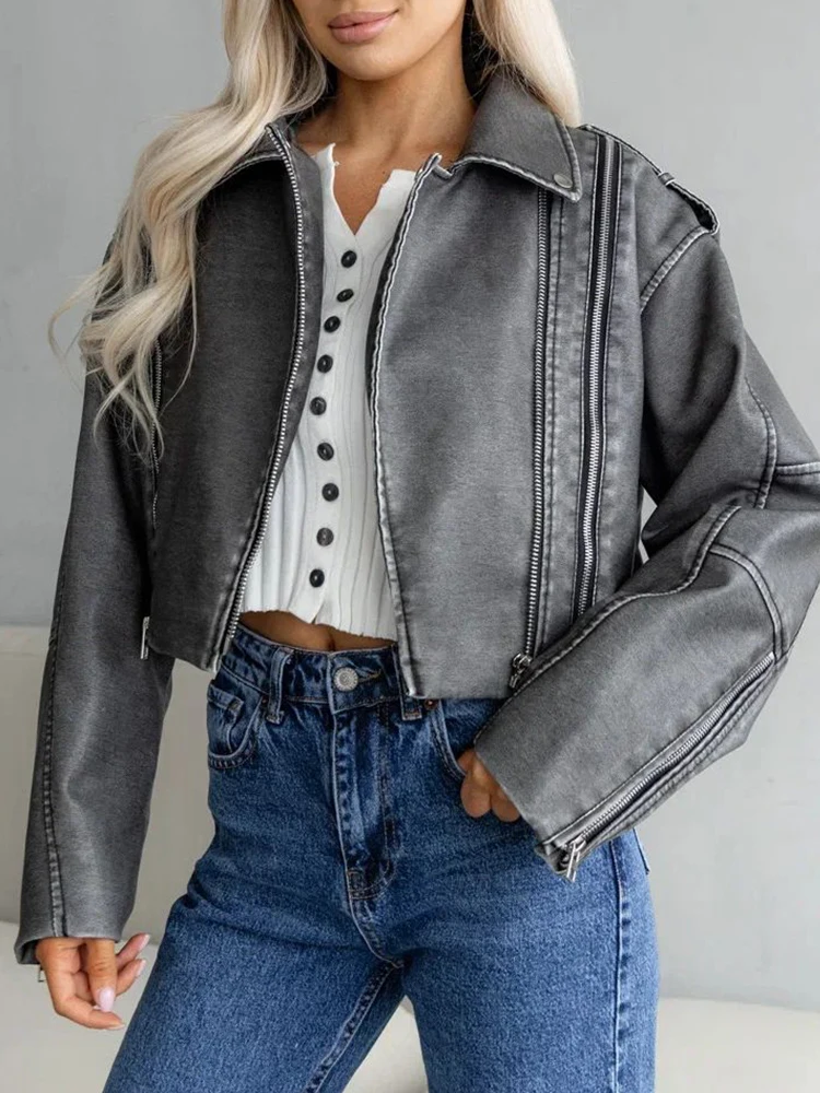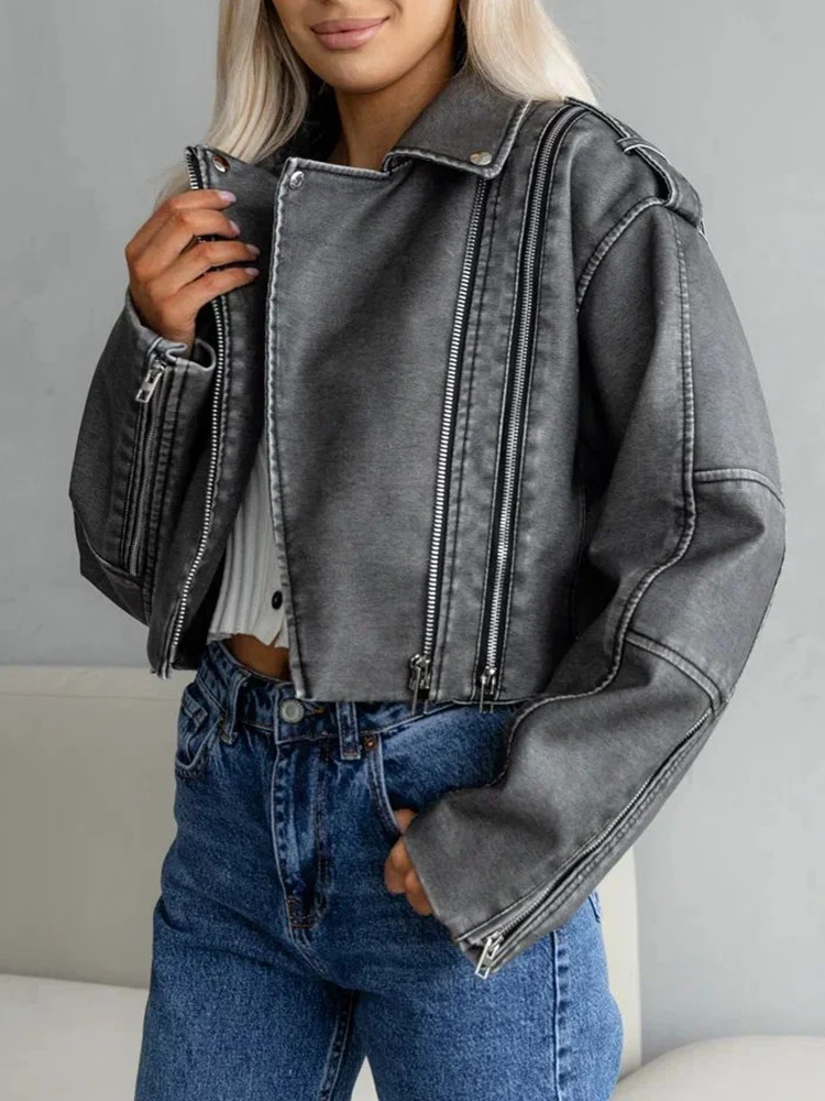 Ailegogo Streetwear Women Retro Short Pu Faux Leather Jacket Spring Autumn Female Zipper Coat Vintage Moto Biker Outwear