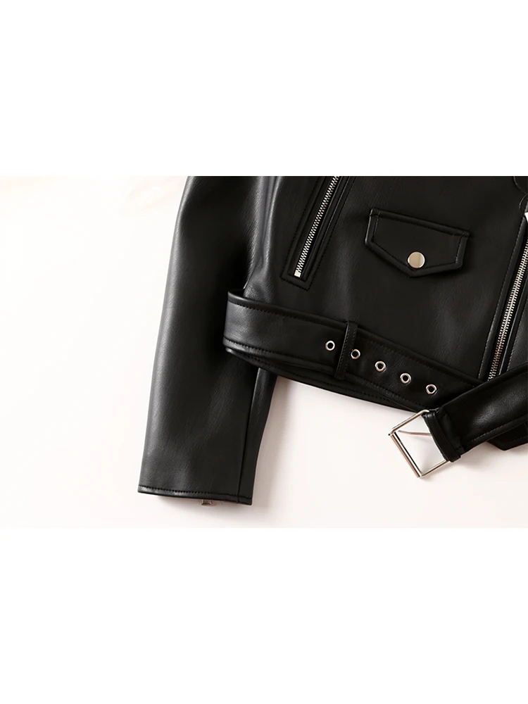 Ailegogo Streetwear Women Slim Fit Black Pu Faux Leather Jacket with Belt Spring Female Motorcycle Biker Zipper Coat Outwear