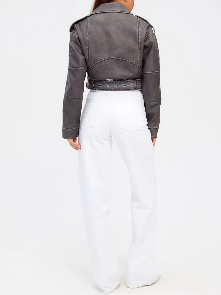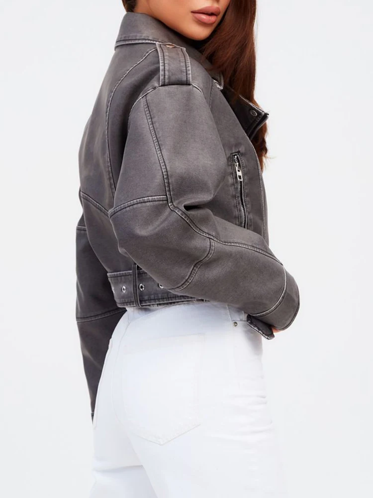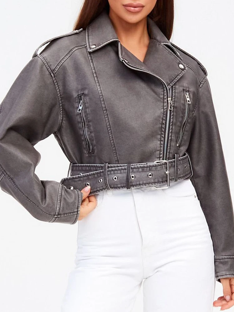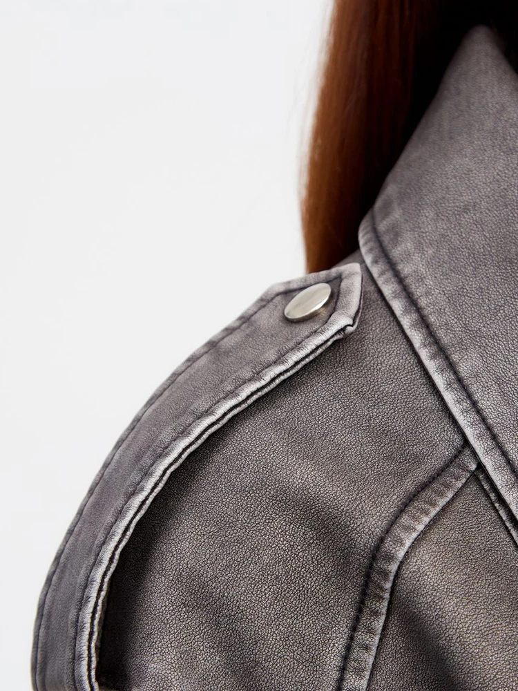 Ailegogo Vintage Women Short Grey Pu Faux Leather Jacket Streetwear Female Spring Autumn Moto Biker Coat Outwear