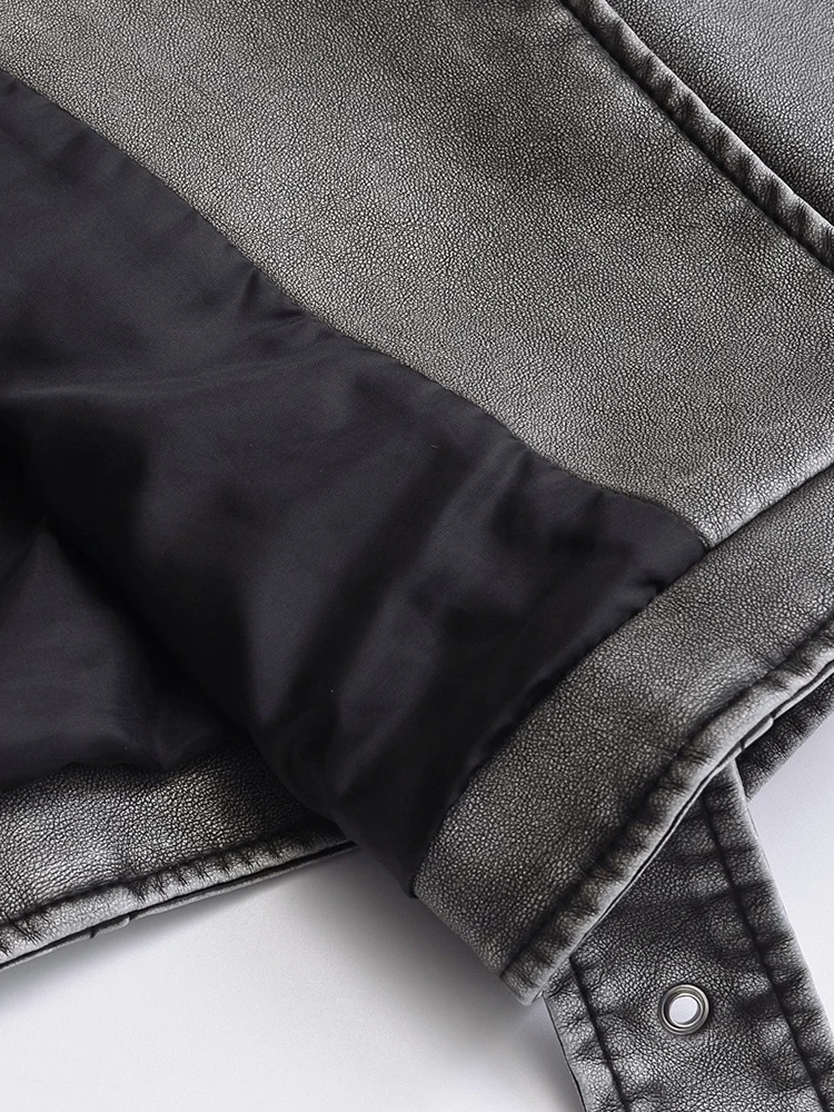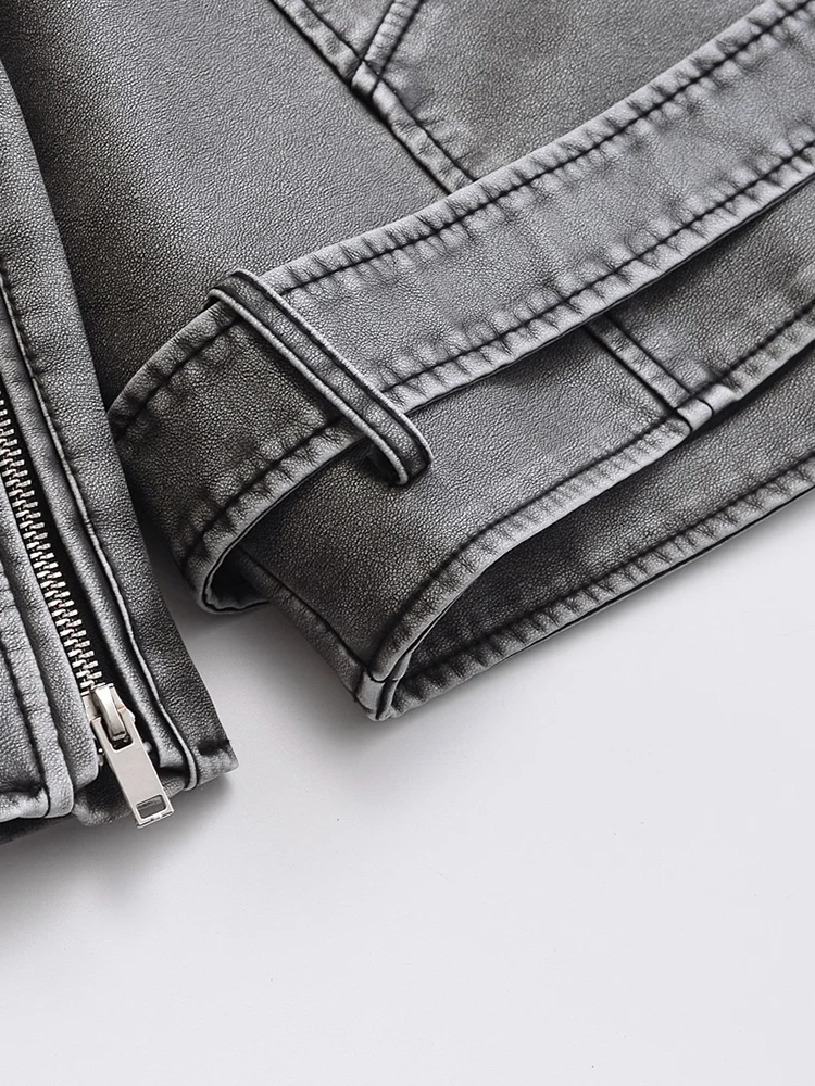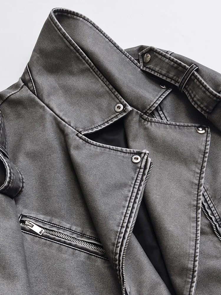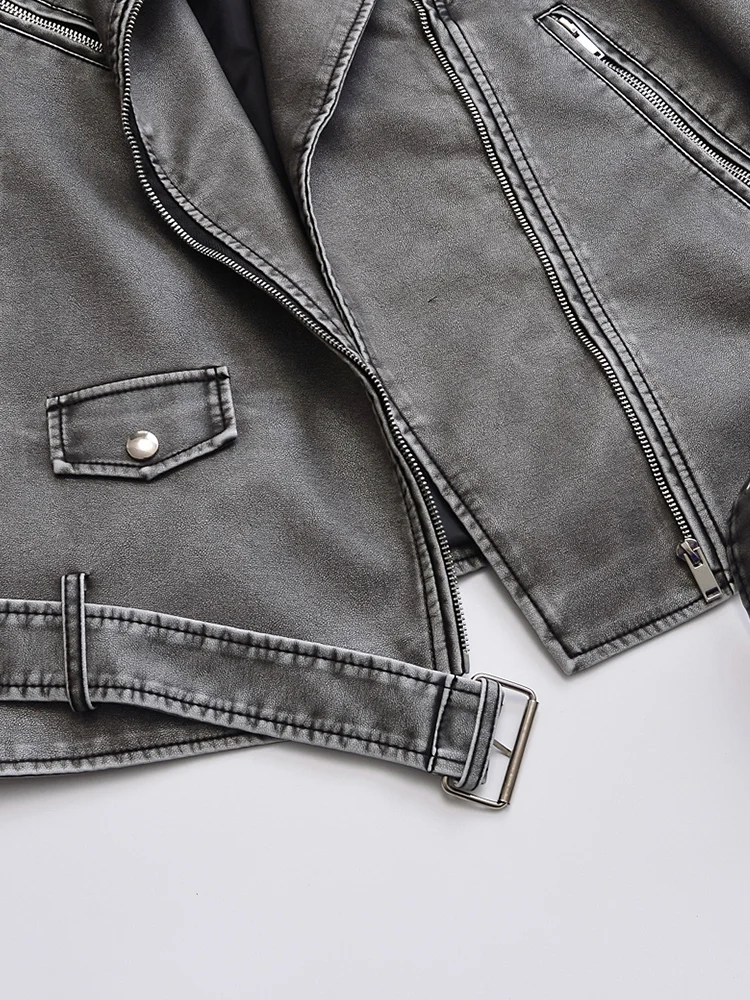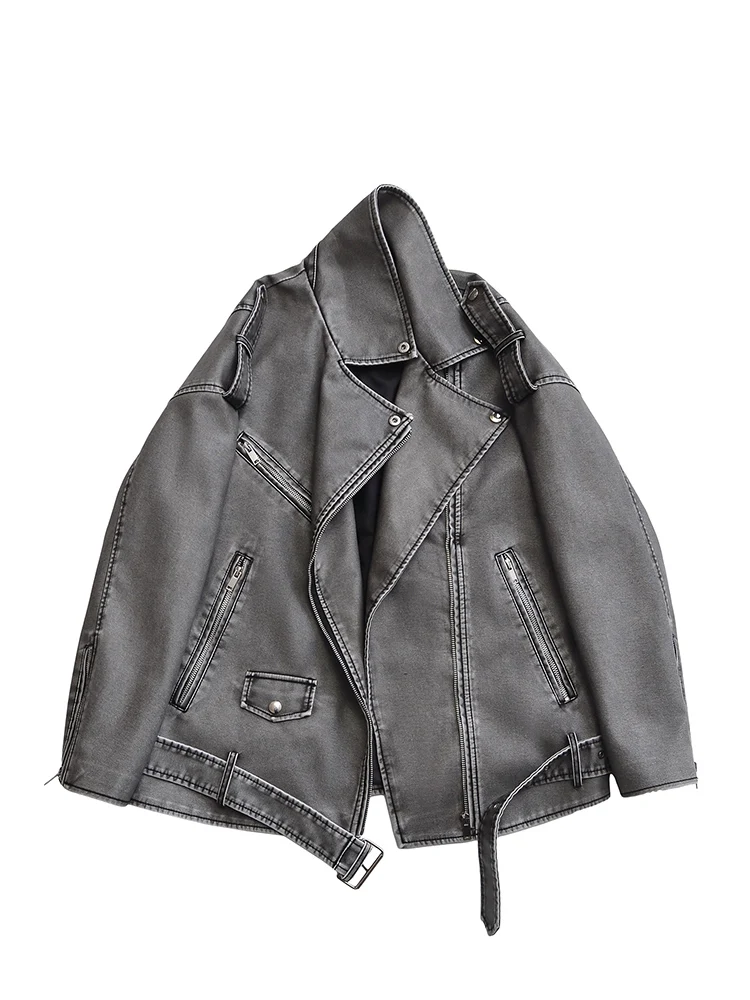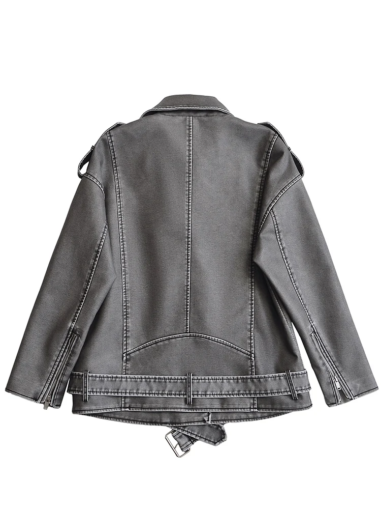 Ailegogo Women Vintage Loose Belt Zipper Pu Faux Leather Jacket Spring Autumn Female Retro Moto Biker Coat Outwear