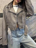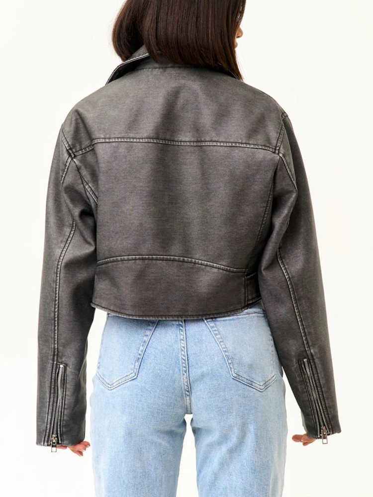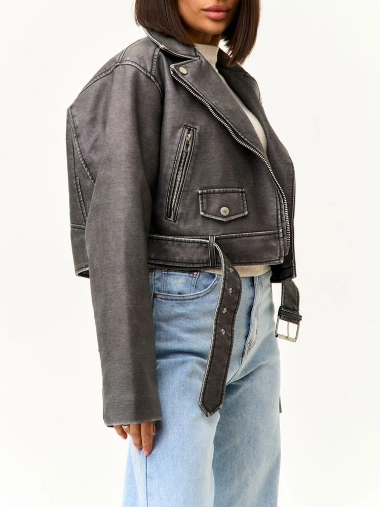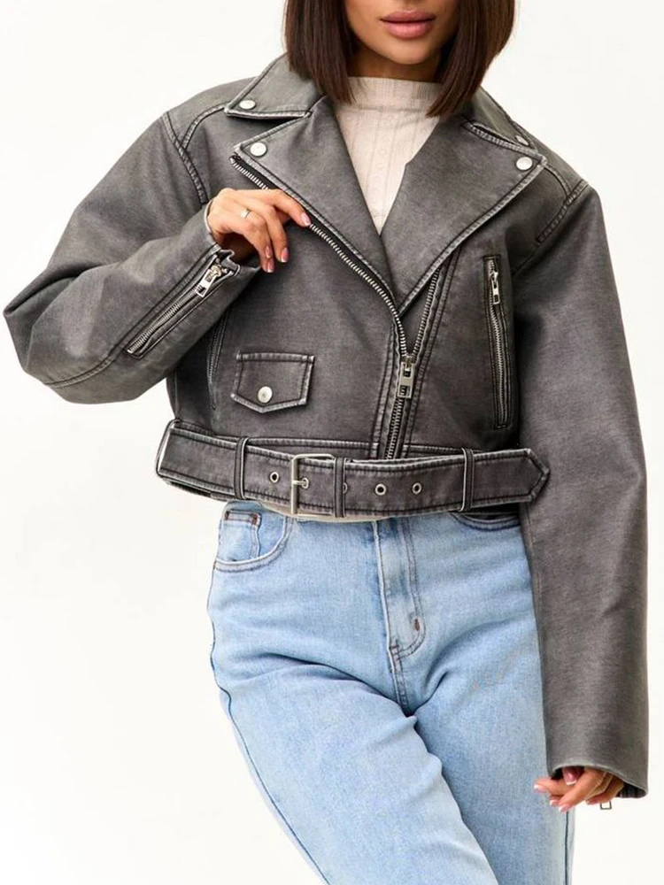Ailegogo Women Vintage Loose Short Pu Faux Leather Jacket Spring Autumn Female Zipper Belt Coat Moto Biker Outwear