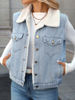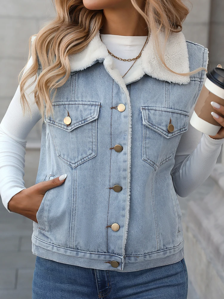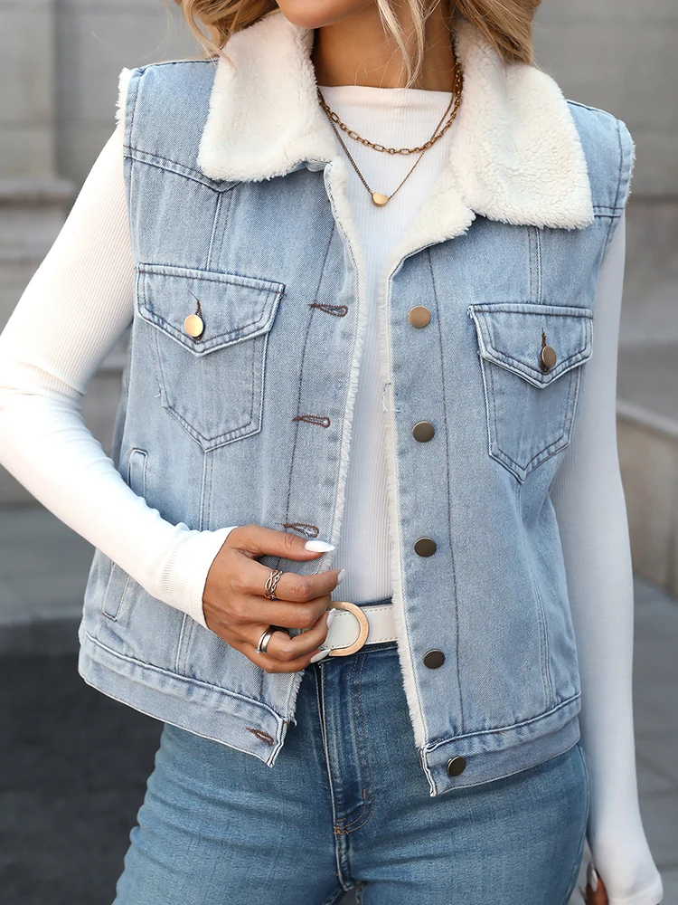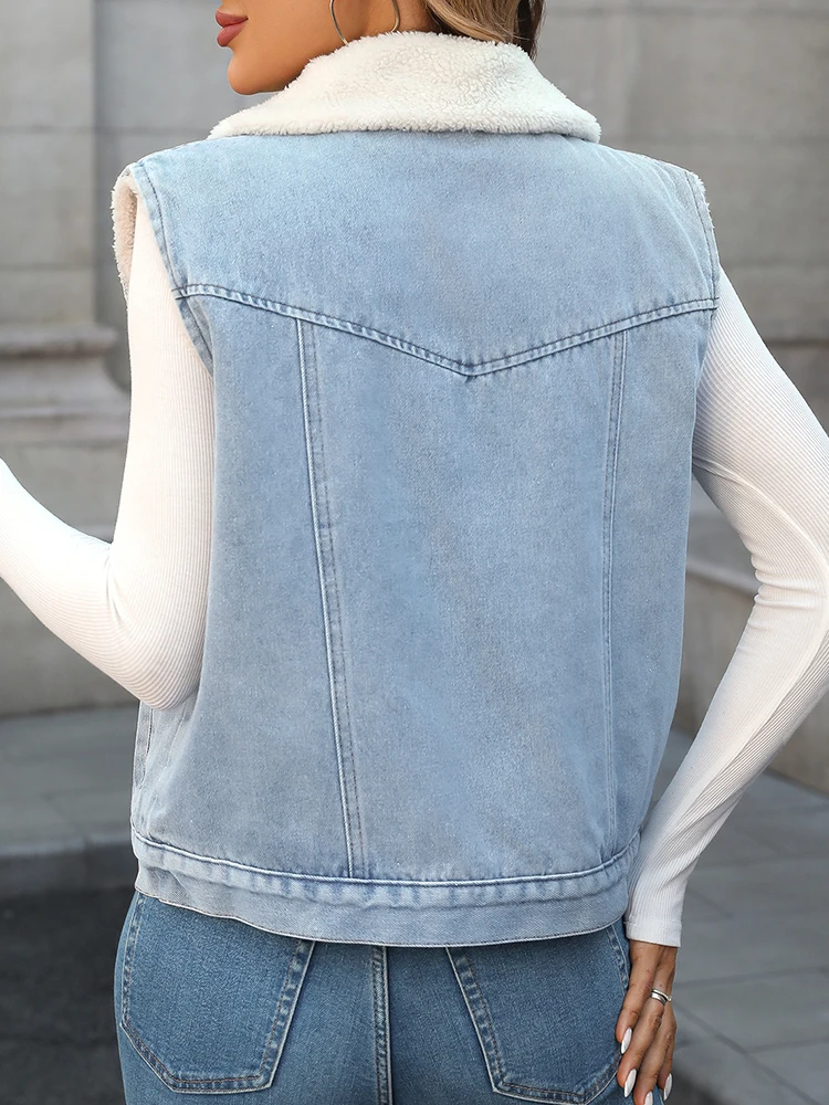 Ailegogo Women Vintage Spliced Denim Faux Lamb Fur Waistcoat Streetwear Female Retro Single Breasted Warm Sleeveless Outwear