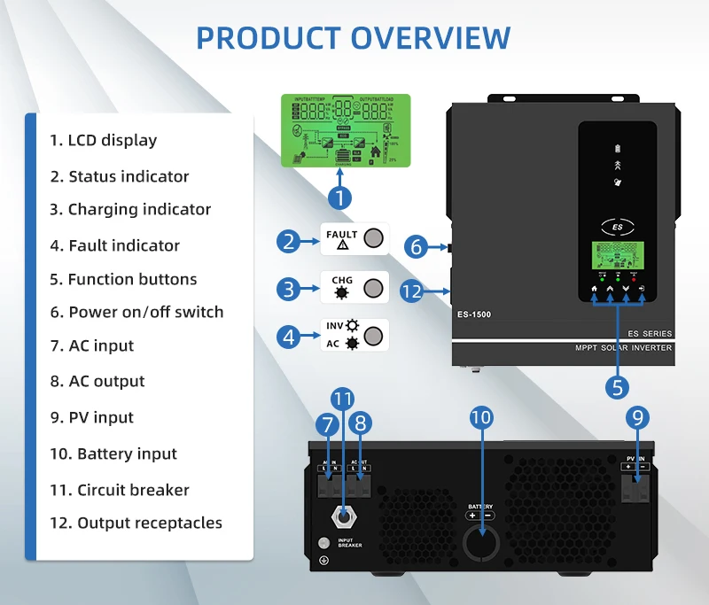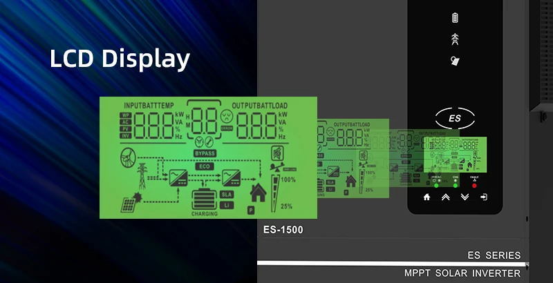 This is a multi-function inverter/charger, combining functions of inverter, solar charger and battery charger to offer uninterruptible power support with portable size. Its comprehensive LCD display offers user-confiqurable and easy-accessible button operation such as battery charging current, AC/solar charger priority, and acceptable input voltage based on different applications.