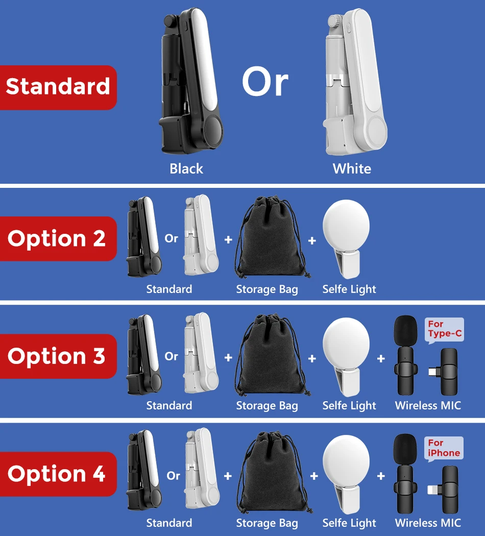 الخيار 4: معيار + حقيبة تخزين + ضوء Selfe + ميكروفون لاسلكي (للهواتف الذكية آيفون)