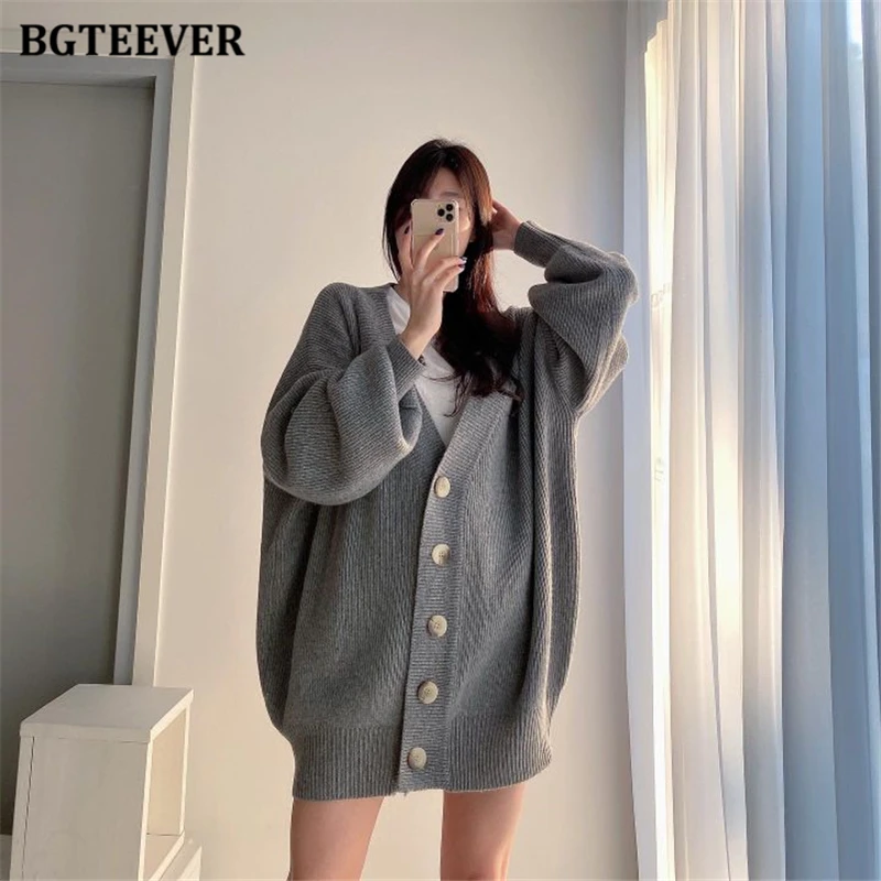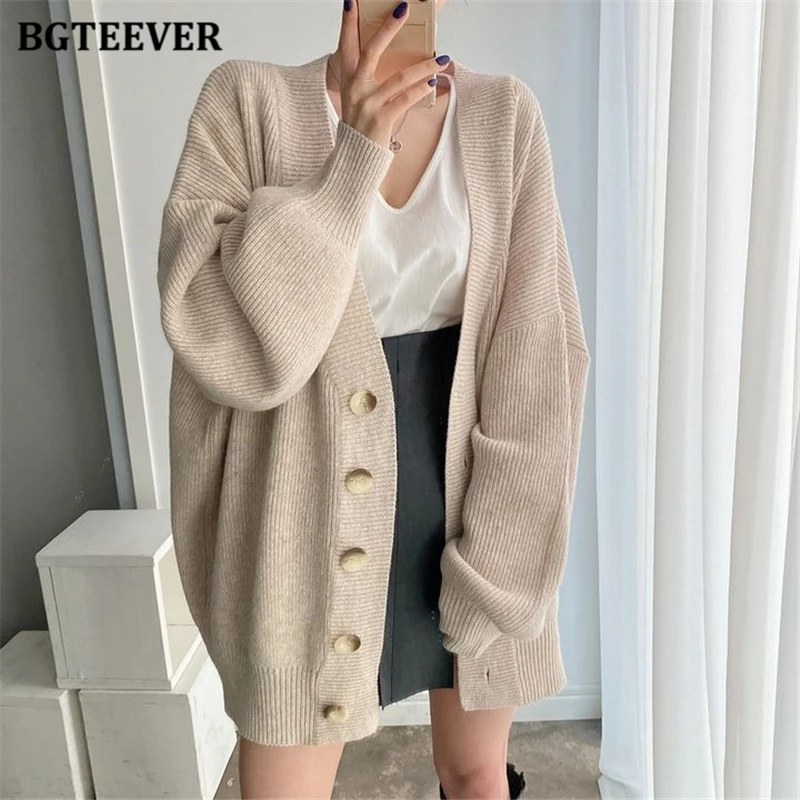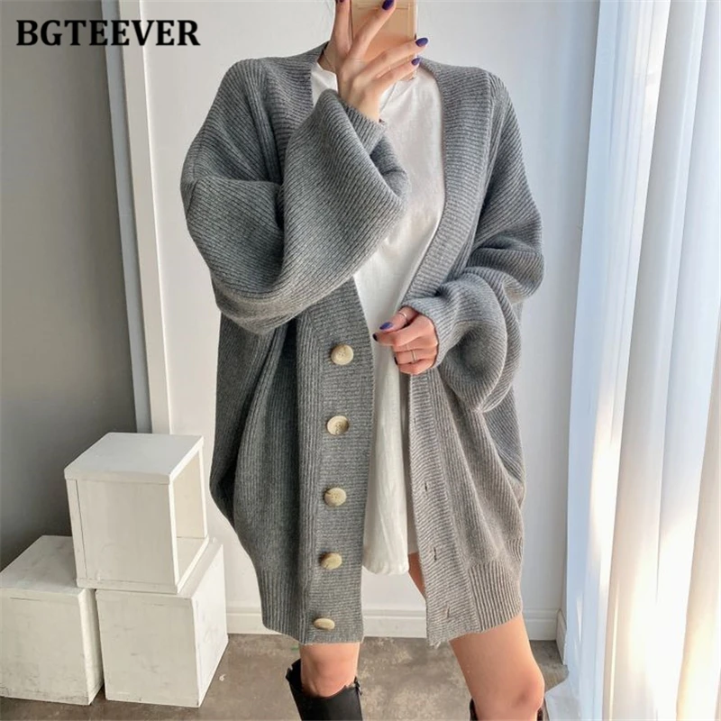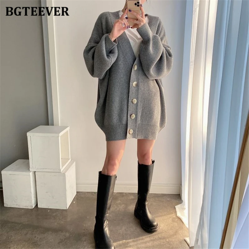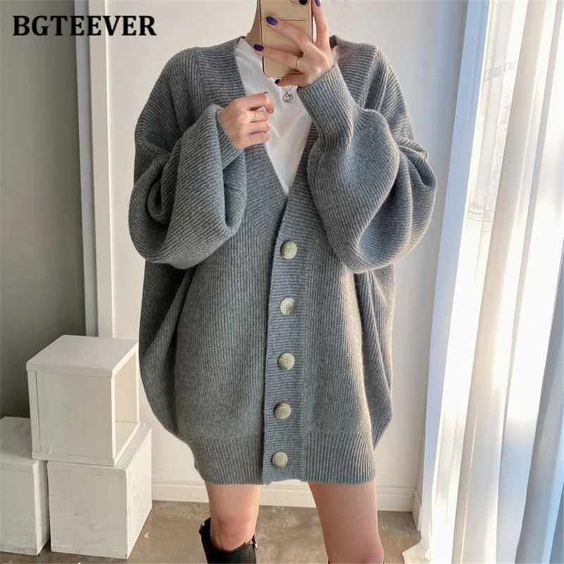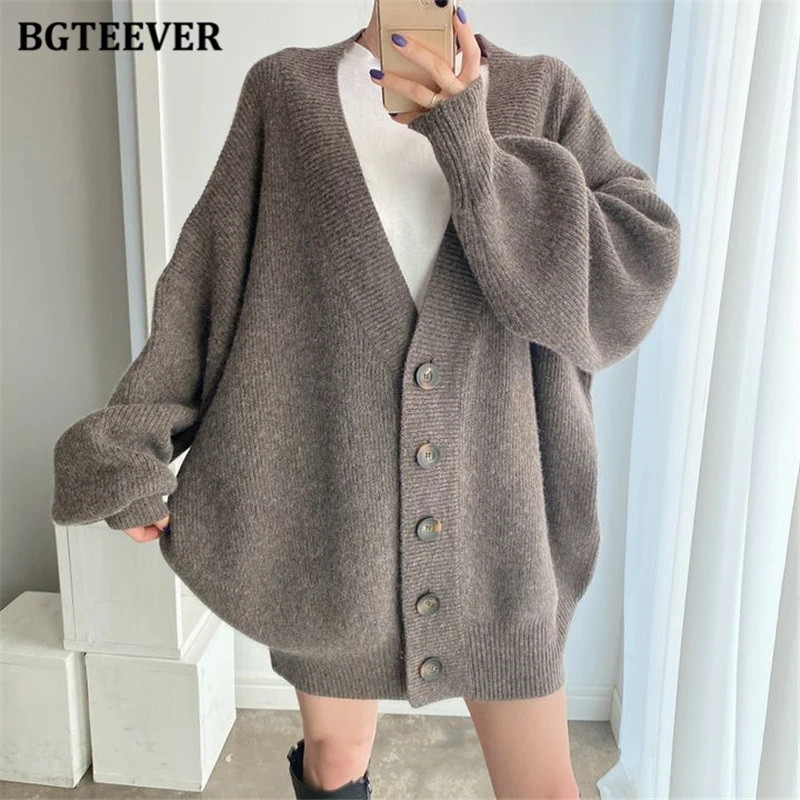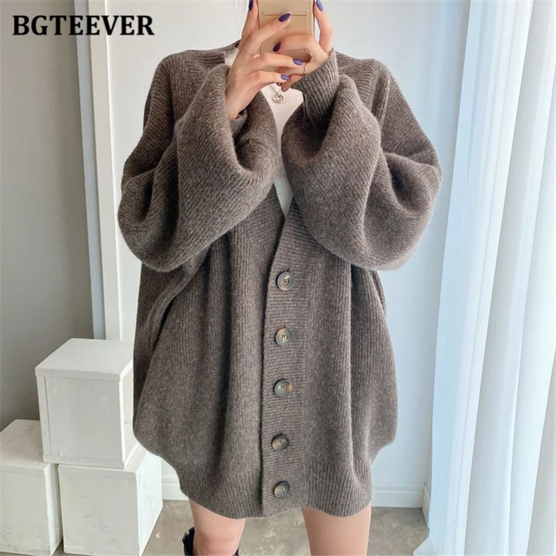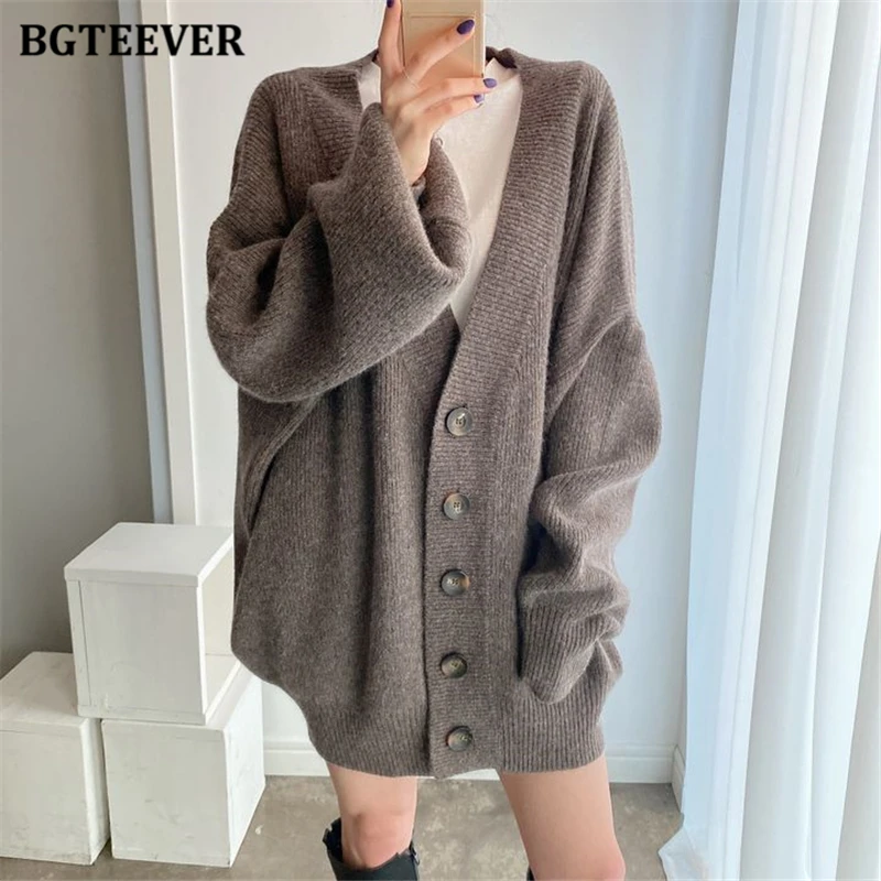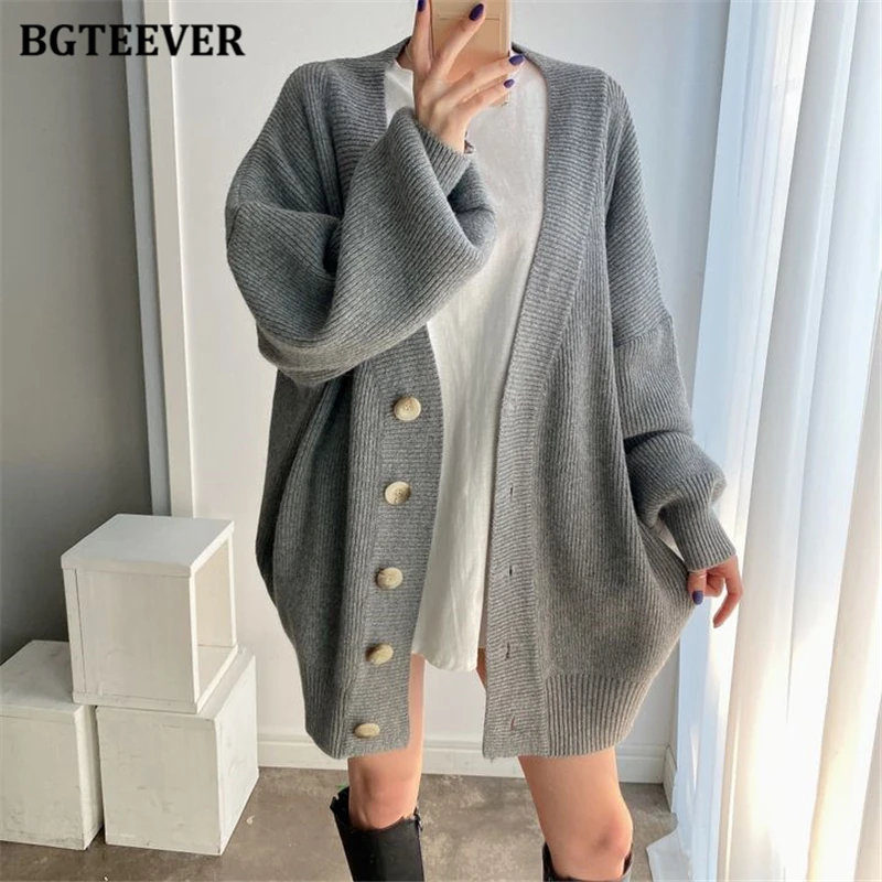 BGTEEVER بلوزات نسائية فضفاضة غير رسمية واحدة الصدر المفتوحة غرزة بلوزات للخريف والشتاء على شكل حرف v وأكمام كاملة للنساء محبوك بأزرار