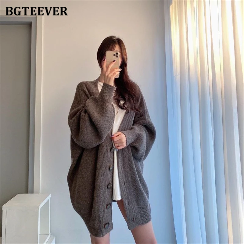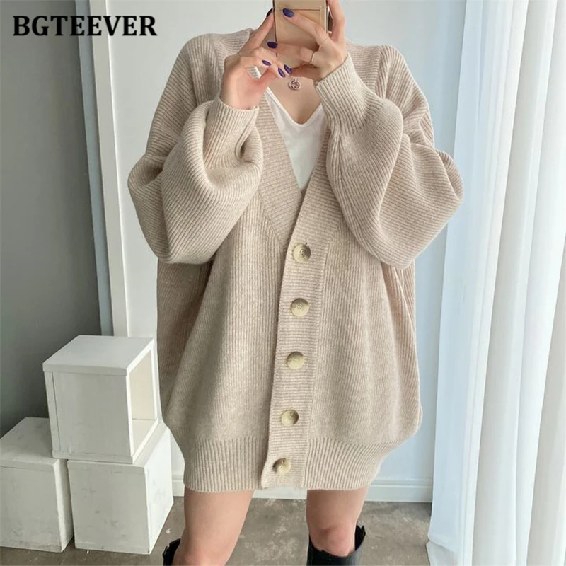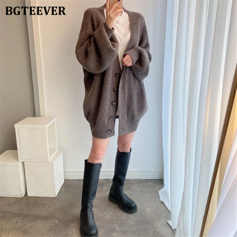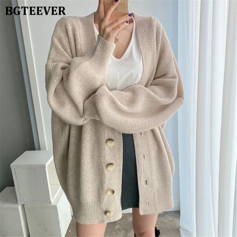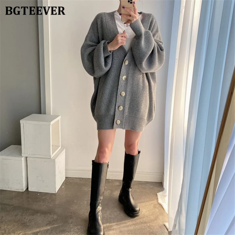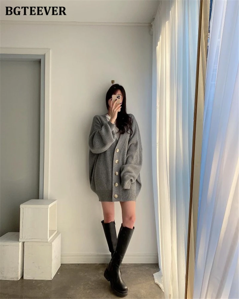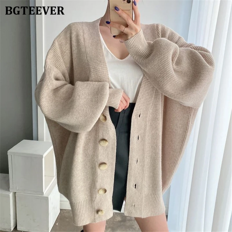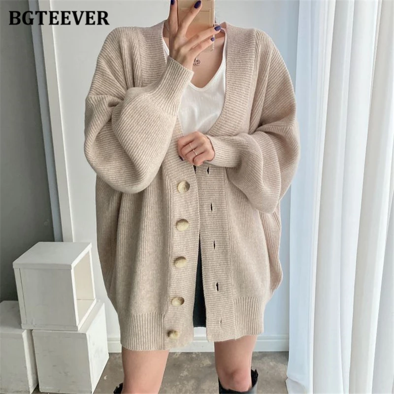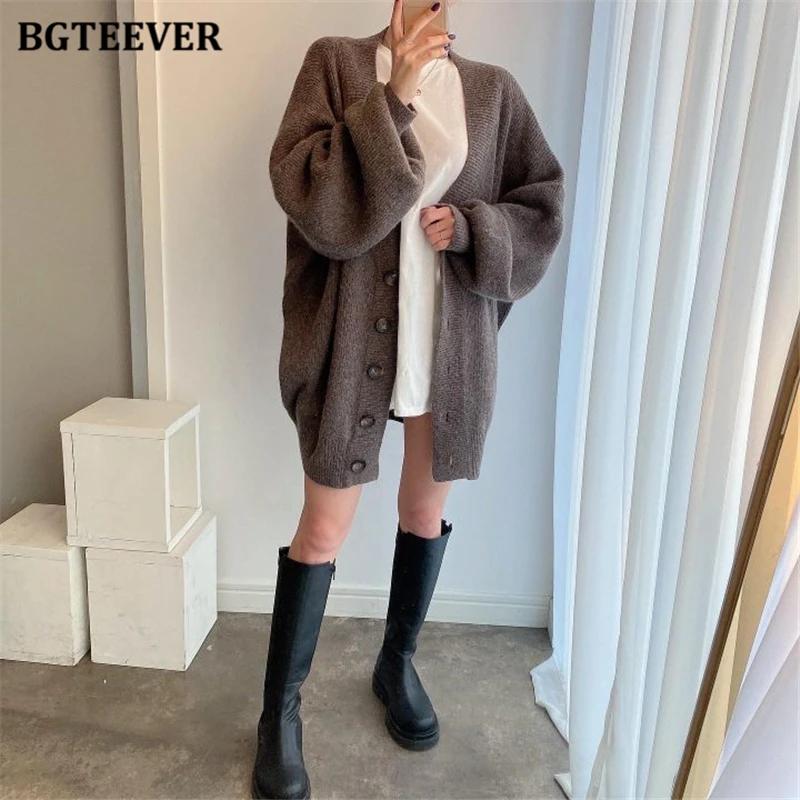 BGTEEVER بلوزات نسائية فضفاضة غير رسمية واحدة الصدر المفتوحة غرزة بلوزات للخريف والشتاء على شكل حرف v وأكمام كاملة للنساء محبوك بأزرار