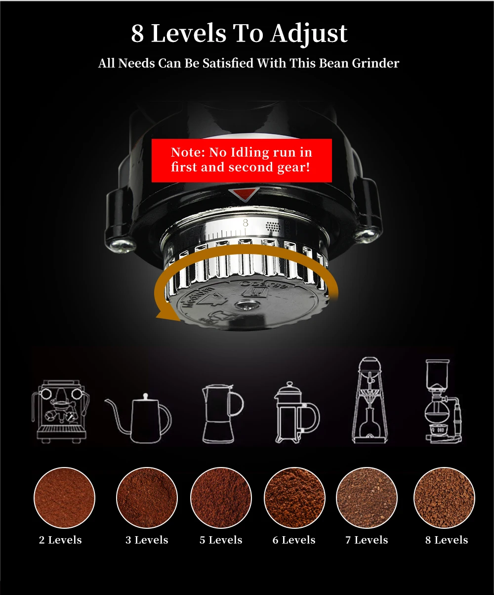 【 1-8 Coffee Thickness Adjustment Stalls】- 8 levels of thickness adjustment, super power coffee grinder with small noise , suitable for small Italian semi-automatic coffee machine, siphon, hand punch, American, French pressure, according to personal taste, or different requirements to adjust