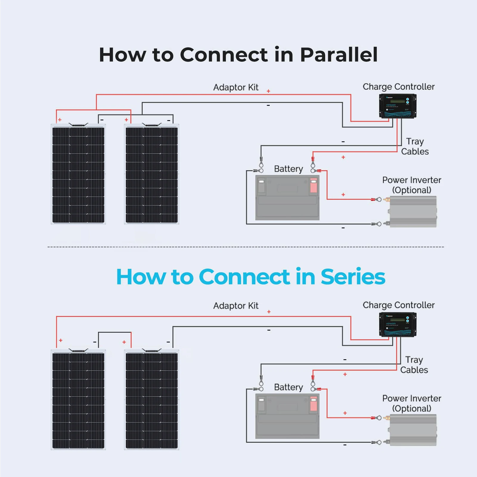 Easy to join up, with pre-connected PV plugs you can simply extend out the wiring and connect to your Adventure BOGUANG Solar Regulator or DC-DC charger (available separately) to instantly start your battery charging.