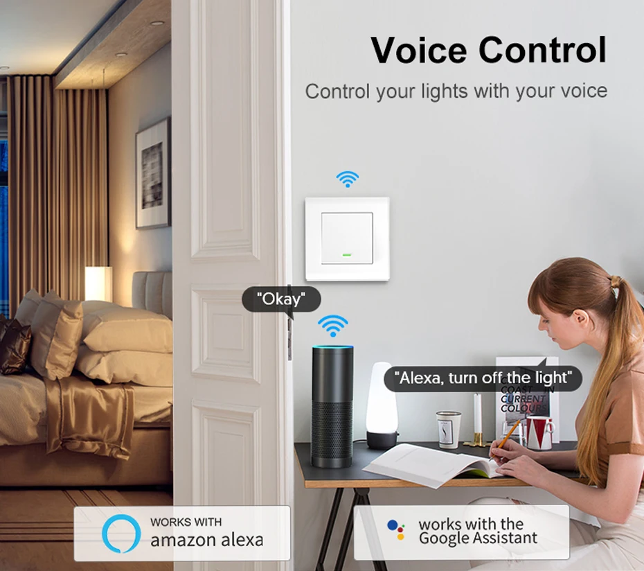 يتيح العمل مع تطبيق Tuya Smart Life التحكم الصوتي البسيط عبر أليكسا ومساعدي Google ، مجرد إعطاء أمر صوتي إلى أليكسا أو مساعد Google Home لتشغيل/إيقاف الأضواء في المنزل.