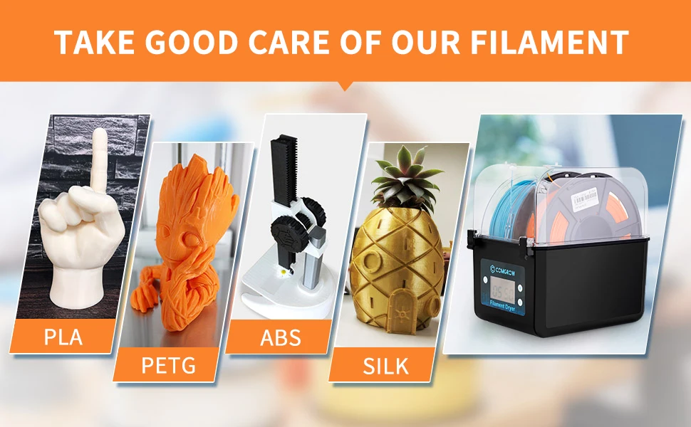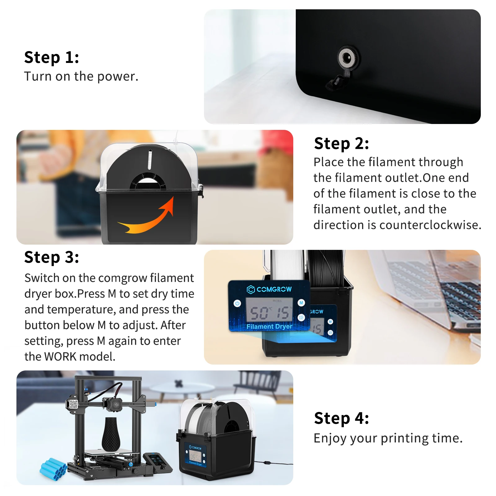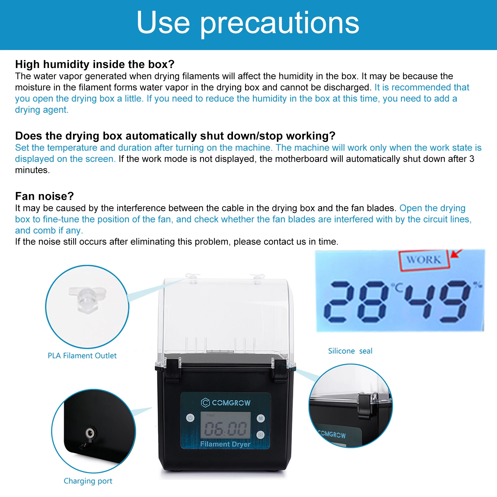[Easy to use] Out of the box and no assembly required. An intuitive digital display and 3 simple touch buttons make your job easier. Dries your filament quickly and effortlessly.