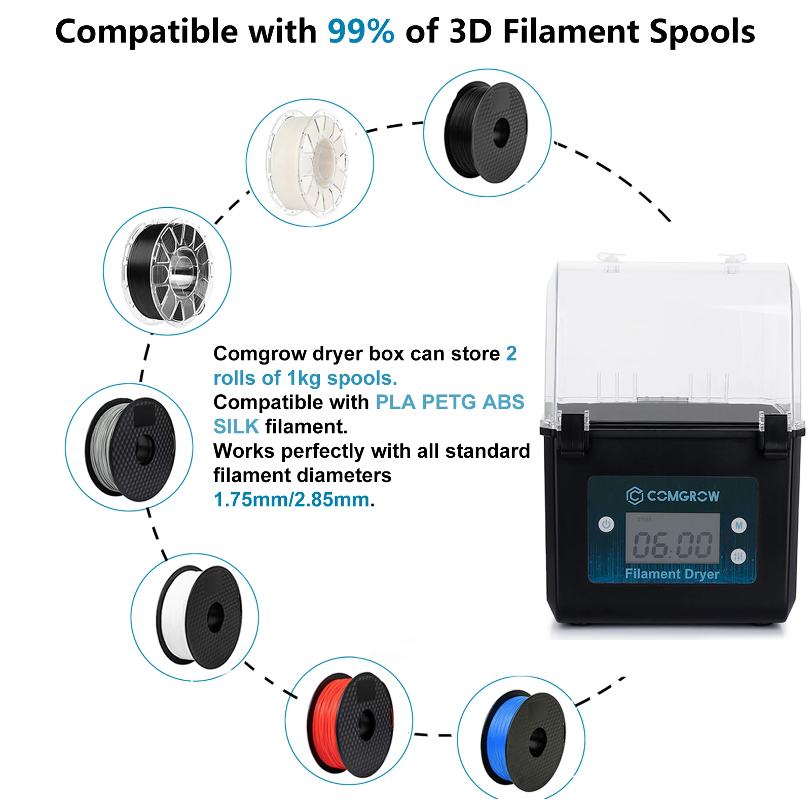 [Multi-purpose] It can dry PLA, ABS, PETG, TPU, and other common filament types in the market. Suitable for a filament diameter of 1.75/2.85mm. And straightforward with great settings for whatever materials you print with.