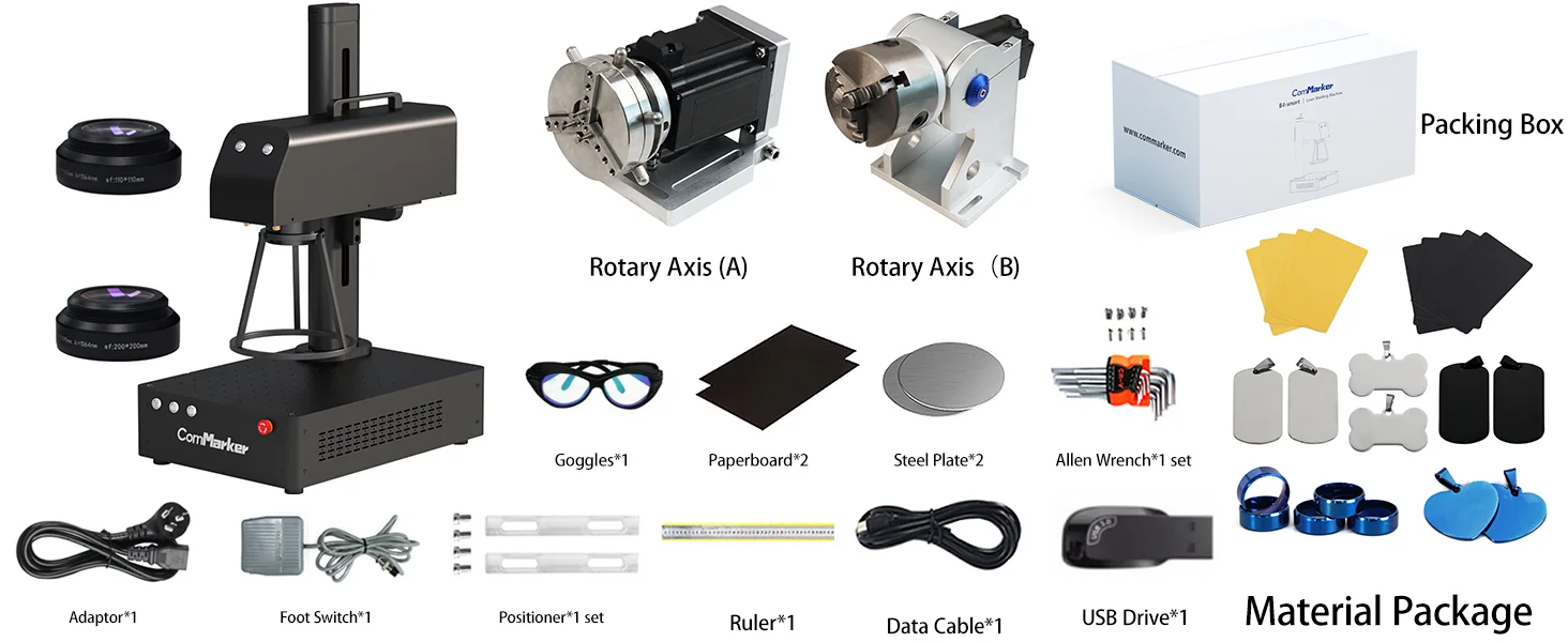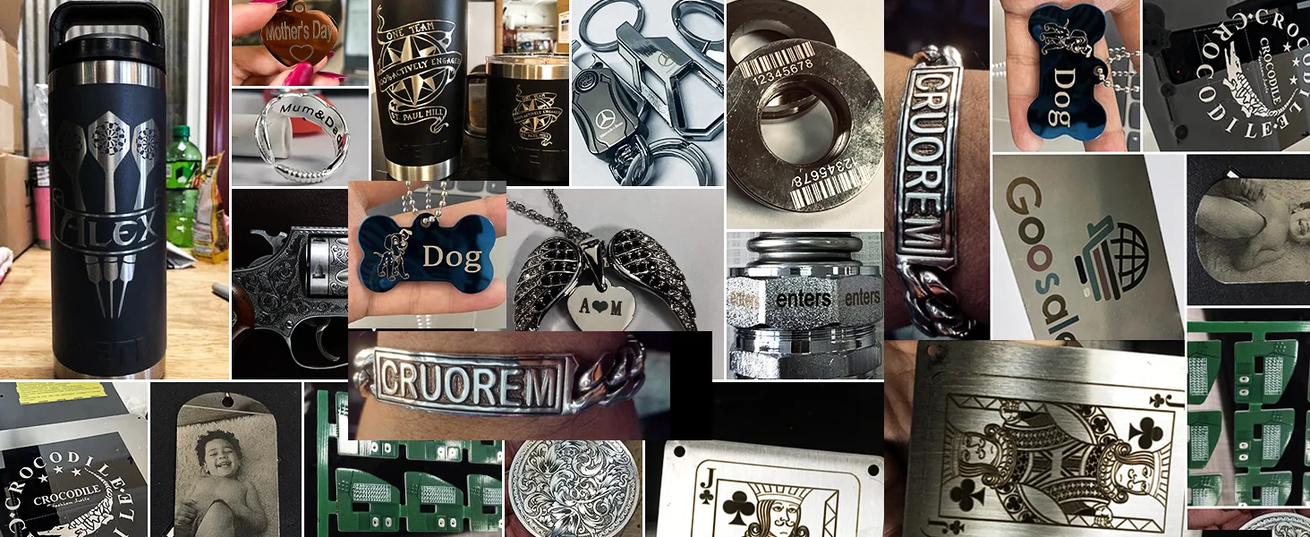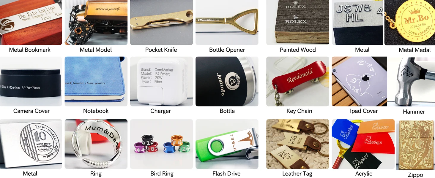 مادة قابلة للنقش: يمكن لآلة النقش بليزر الألياف ComMarker نقش الفولاذ المقاوم للصدأ والألومنيوم والذهب والفضة والسبائك وما إلى ذلك، كما يمكنها وضع علامة على معظم المنتجات المطلية والبلاستيك غير الشفاف. آلة نقش المعادن والمجوهرات والقلم والعلامة والبهلوانات.
