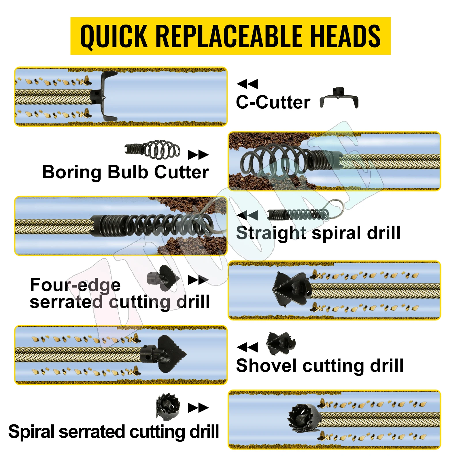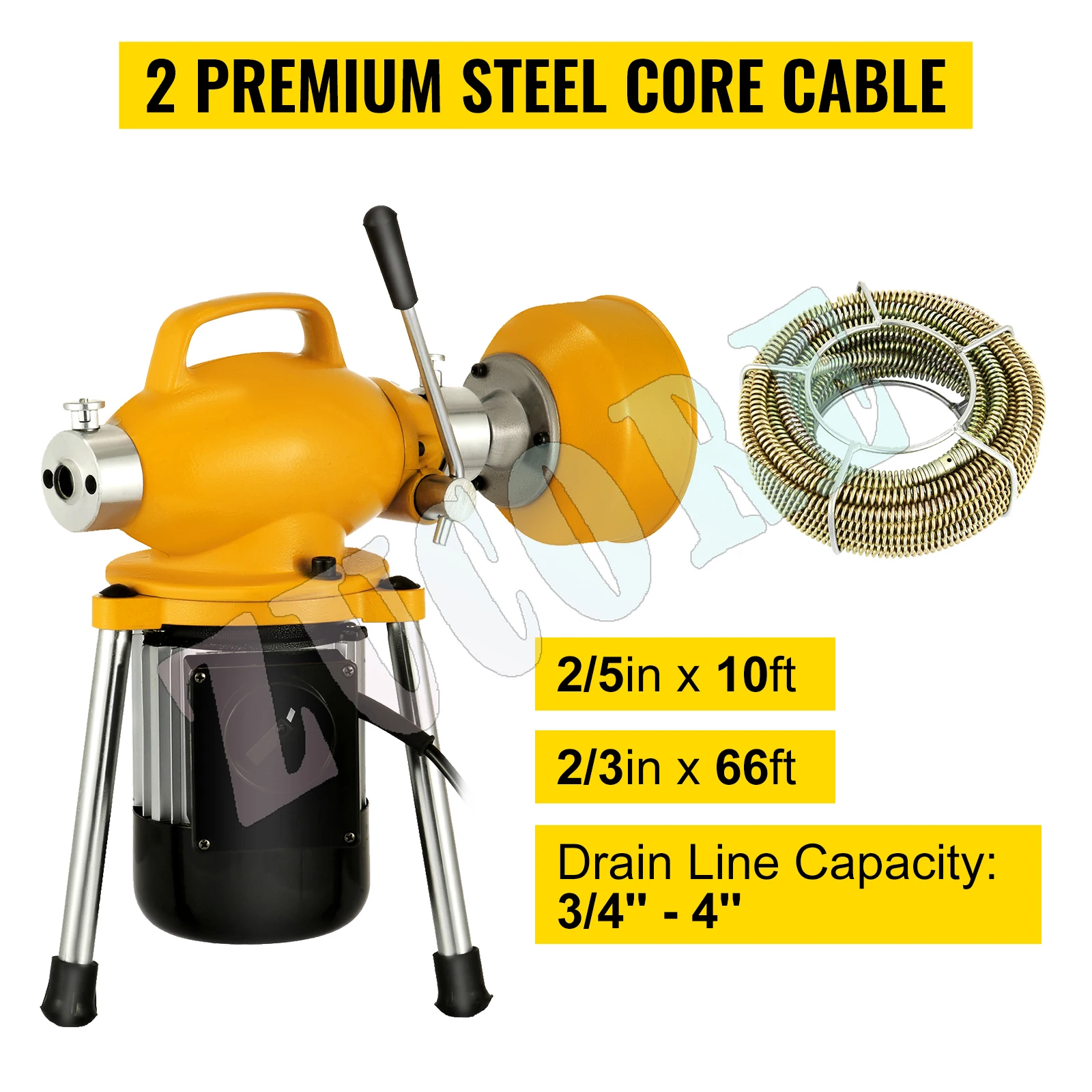This premium steel core cable effectively resists breakage, tangling, kinking, and corrosion. The drain cleaner machine is suitable for 3/4” – 4”/20-100mm pipe.