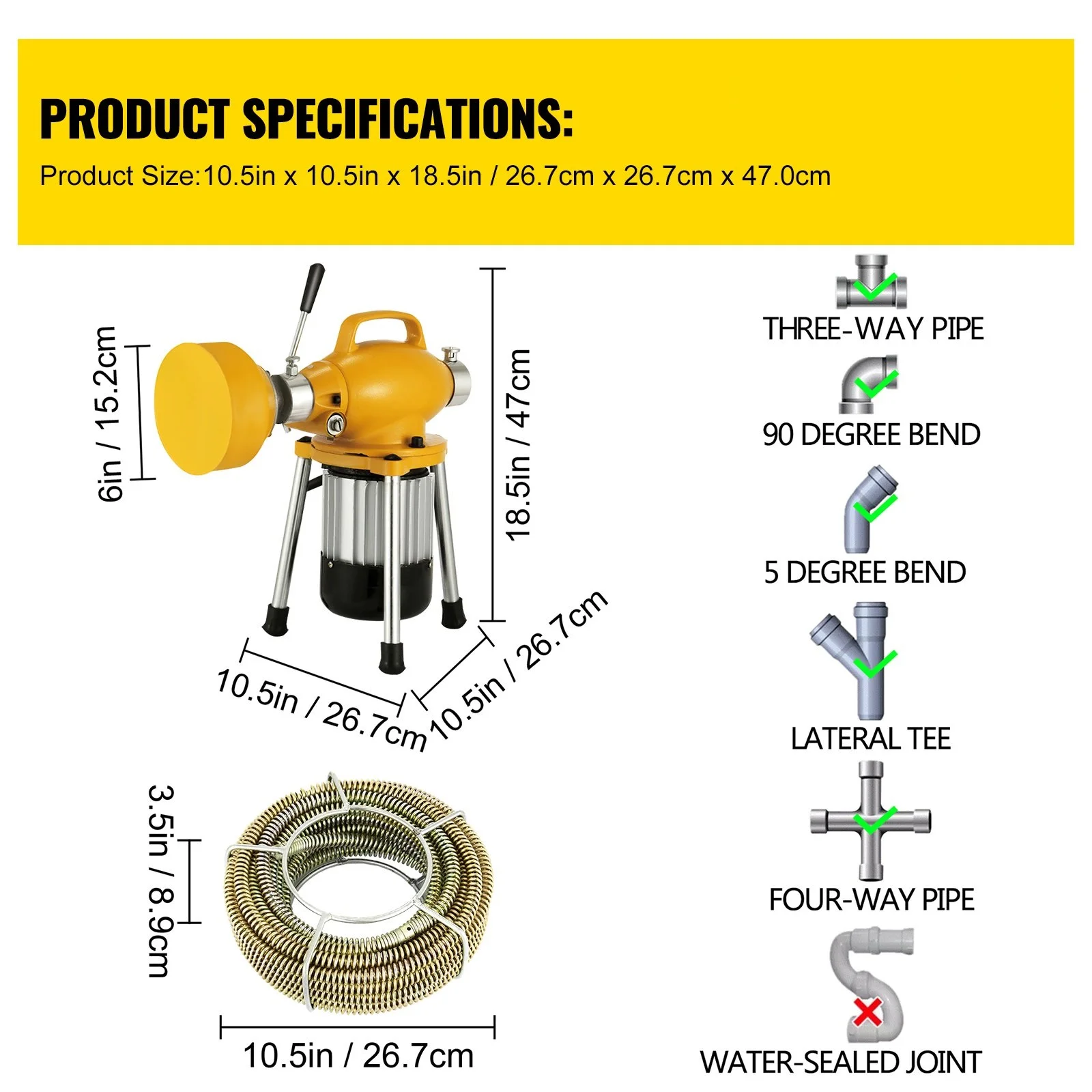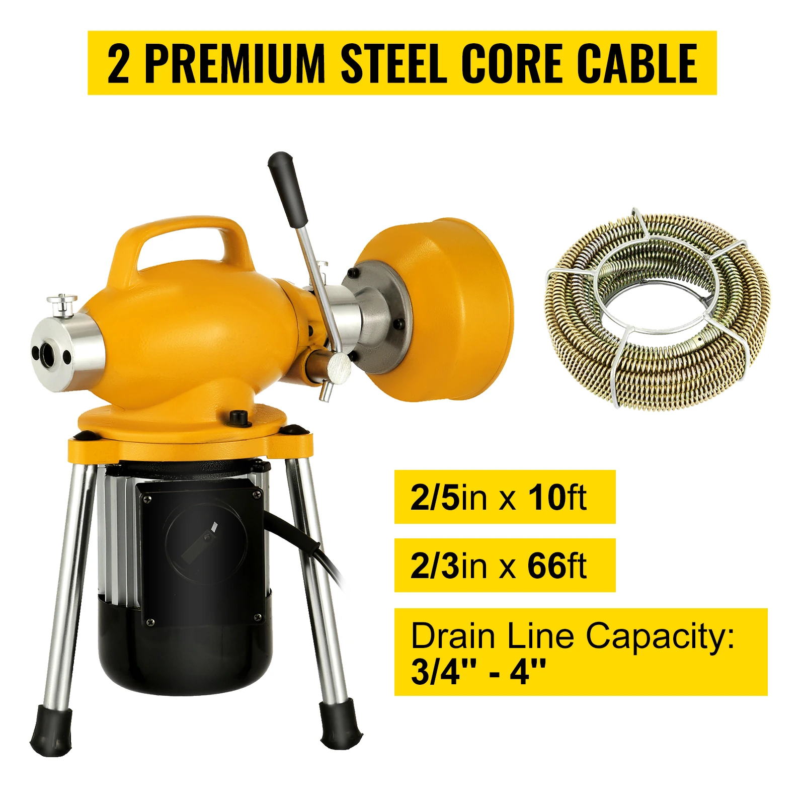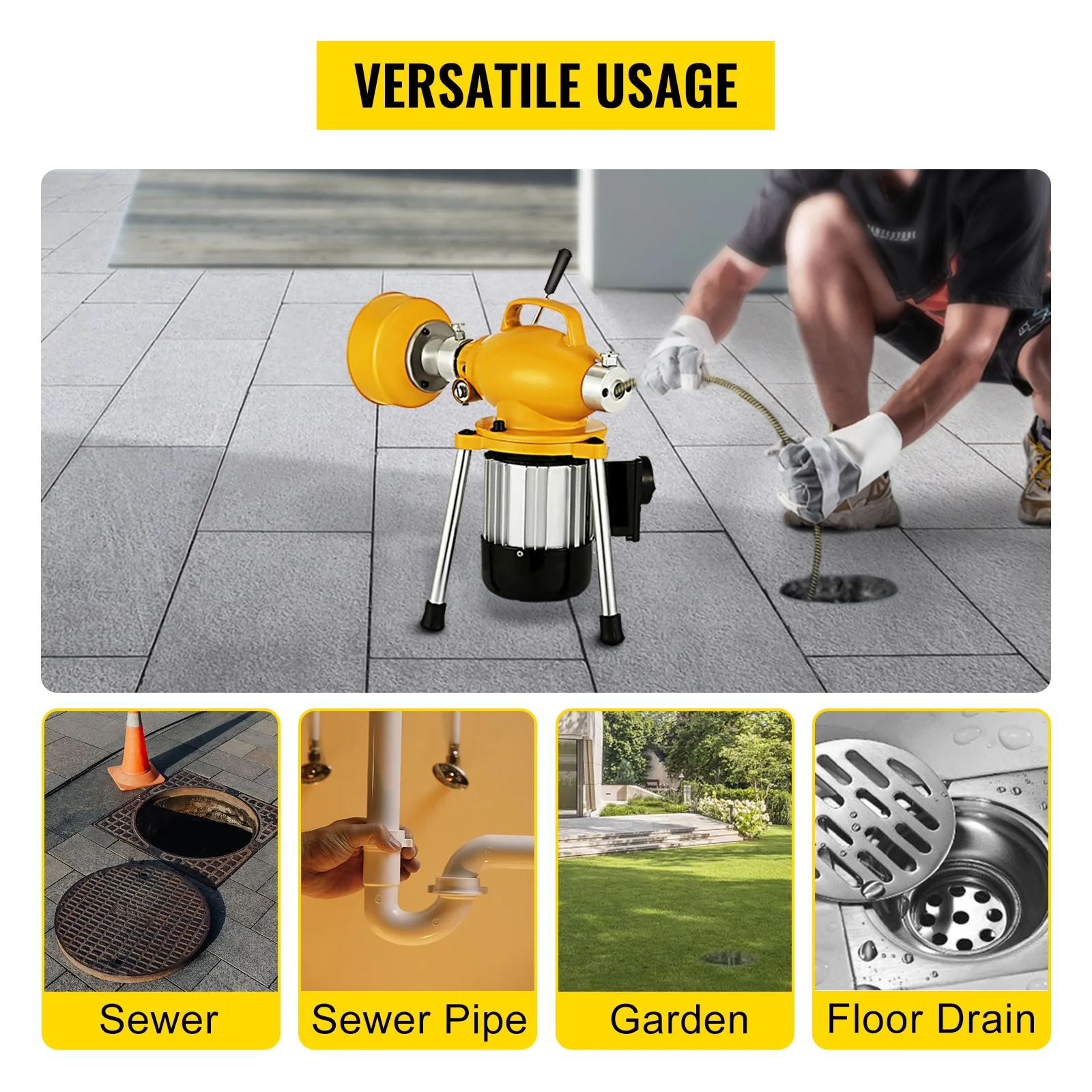 The versatile sewer cleaning machine is an easy-to-use drain machine with a portable design. It features a durable iron integrated body that maximizes its lifespan. Pull the handle down, and the cable can spin at 400rpm. Ideal for the sink, shower, and floor drains.
