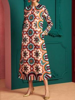 Autumn Women Print Casual Dress New Holiday Elegant Loose Long Dresses Female V-neck Long Sleeve Beach Party Dress Robe Femme