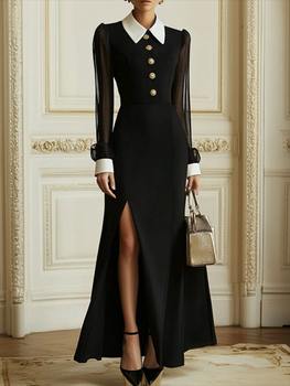 Freeacy Slim Fit Elegant Evening Dress for Women Contrast Color Lapel Collar Mesh Sleeves High Waist Split-side Maxi Dresses
