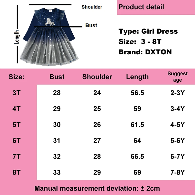 | حجم | الملابس طول | تمثال نصفي | الكتف العرض | أقترح سن | أقترح ارتفاع |