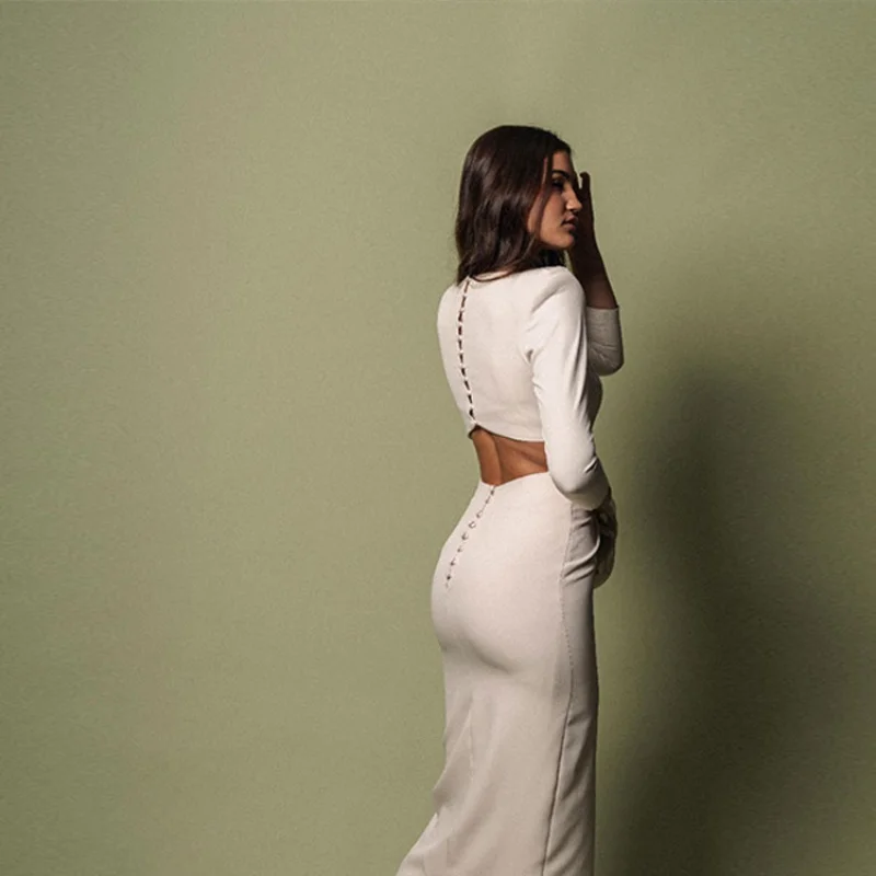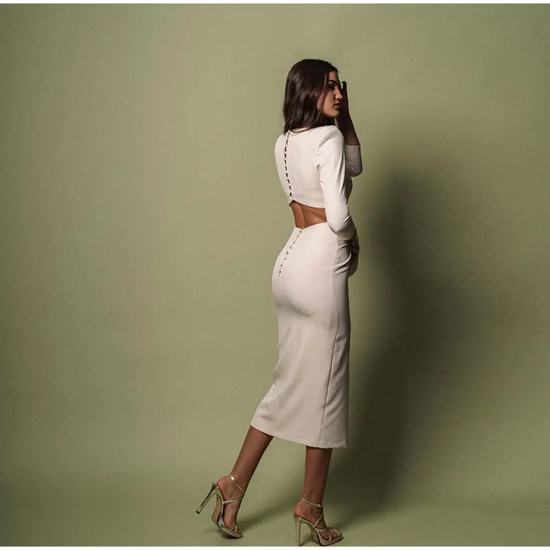 Elegant 3d Flower Hollow Out Slit Long Women Dress Fashion Skinny O Neck Full Sleeve Button Dresses New Lady Highstreet Robes