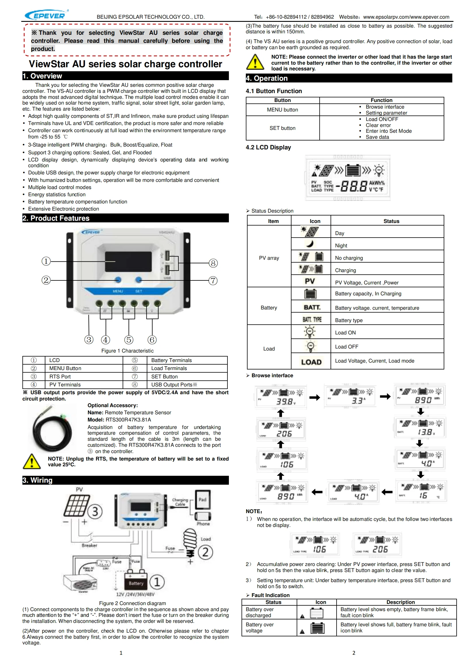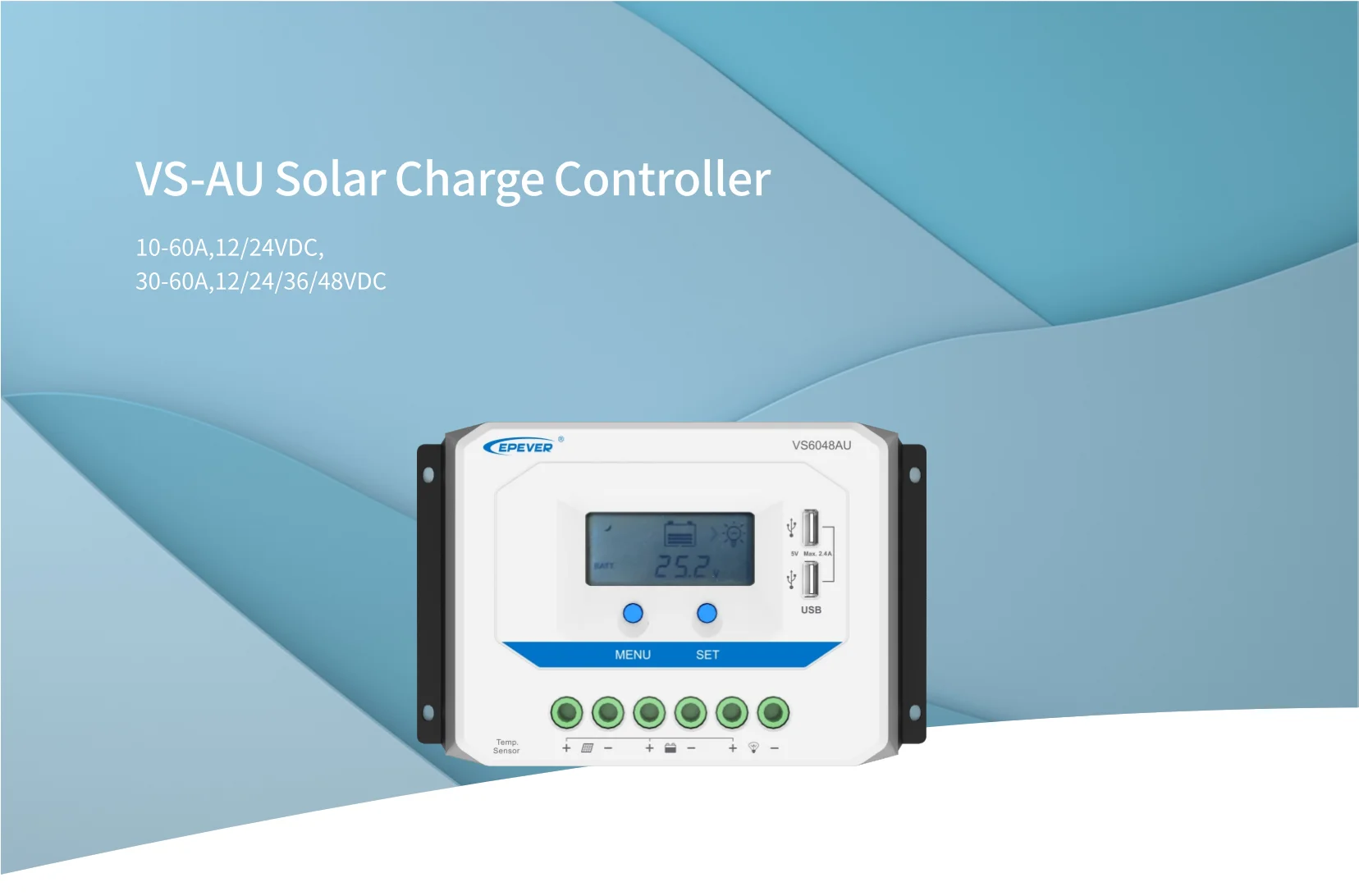 VS-AU series is a PWM charge controller with LCD display and two USB ports. When the gap between solar panel working voltage and battery voltage is not big, choosing this PWM series is an equally reliable but more cost-effective solution. It is widely applied to rural Electrification and home power systems etc.