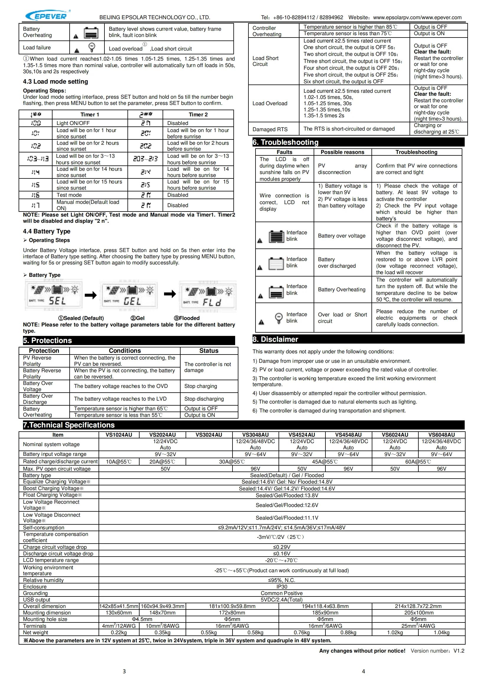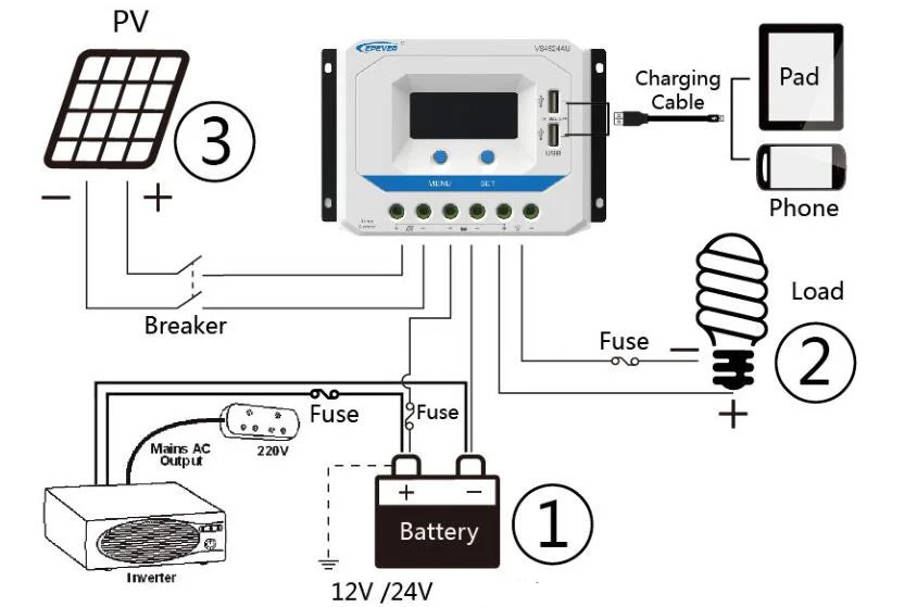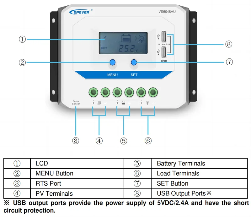 EPEVER PWM Solar Panels Power Regulator VS-AU built in LCD Display Dual USB Ports 12V 24V Auto 10A 20A 30A 45A 60A