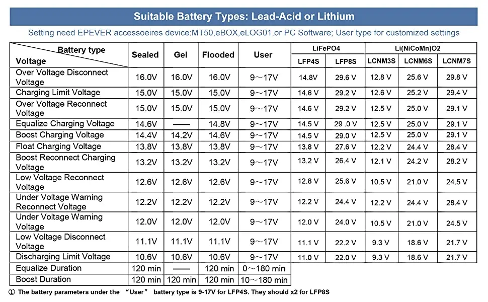 Lead-acid(Sealed/Gel/Flooded)/Lithium(LiFePO4/Li(NiCoMN)O2)/User |