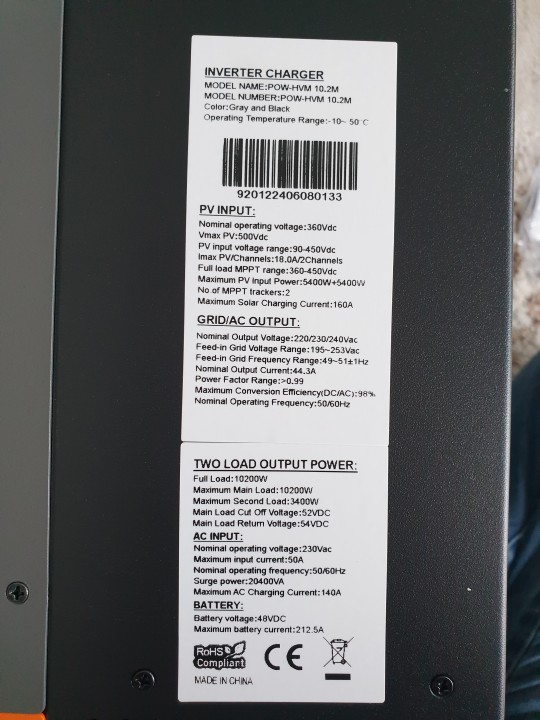 【Technical Parameter】160A MPPT Solar Charging Inverter, MAX. PV Array Power: 10200W, Max.PV Open Circuit Voltage: 500Vdc; Starting voltage >150V, MAX. Charging Current:160A, PV Array MPPT Voltage Range: 90~450Vdc; Cold start function(46V).
