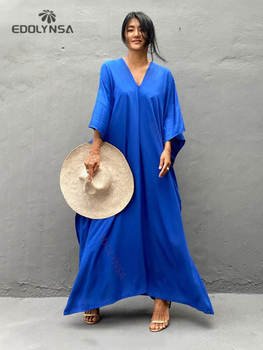 2022 الأبيض الصلبة مجموعة البكيني الغطاء مثير الخامس الرقبة 3/4 كم طويل قفطان فستان الشاطئ ملابس للنساء ثوب السباحة التستر A1042