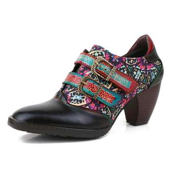 النساء مضخات الرجعية المطبوعة هوك و حلقة الربيع/الخريف جلد طبيعي سبايك الكعوب جولة تو أحذية امرأة سوداء غير رسمية