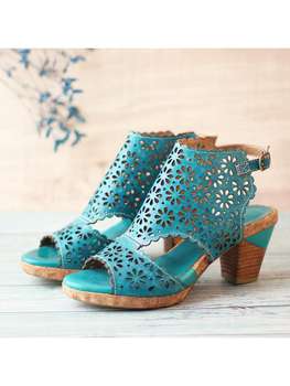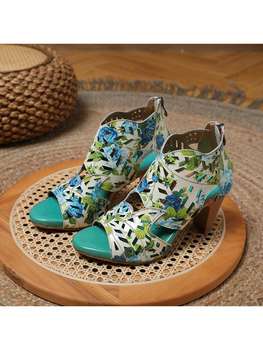الصيف النساء الصنادل الرجعية جلد طبيعي عالية الكعب 6.5 سنتيمتر كعب مربع اللمحة تو الزهور عادية مكتب الوظيفي النساء الأحذية الأزرق