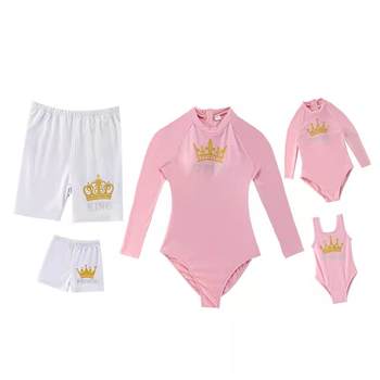 الأسرة مطابقة الملابس الصيف أمي وابنتها المايوه الوردي طويلة الأكمام تاج ملابس السباحة الأب والابن الأبيض السباحة جذوع