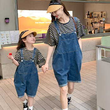 جديد 2023 طقم جينز للأم وأنا قميص صيفي مقلم بأكمام قصيرة وفستان من قماش الدنيم ملابس عائلية أنيقة مطابقة للقطعتين