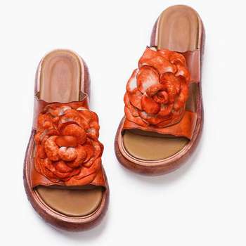 الصيف النساء الصنادل الموضة الكلاسيكية العرقية الرجعية جلد طبيعي الانزلاق على شقة مع زهرة اصبع القدم مستديرة أحذية نسائية غير رسمية 35-40
