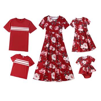 الأسرة مطابقة الملابس الأم وأنا الأحمر فساتين مُزينة بنقشة الزهور الصيف الأب ابن شريط قصير الأكمام تي شيرت الأم ابنة فستان