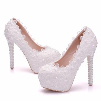 النساء أحذية مضخات فستان الدانتيل منصة مقاوم للماء جولة تو الكعوب رقيقة 14 سنتيمتر عالية الكعب المرأة أحذية الزفاف