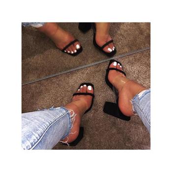 النساء الصنادل البلاستيكية الانزلاق على 11 سنتيمتر كعب مربع عالية الكعب جولة تو الضحلة النساء أحذية sandalias mujer 2023 حجم 35-42 البيج